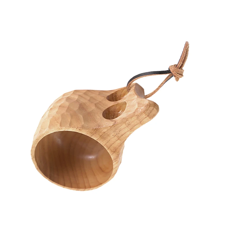 Подвесная конструкция: деревянная чашка из натурального каучука, с гладкой поверхностью, двумя крепежными отверстиями и кожаной веревкой, которую можно легко повесить на рюкзак или кухню.
