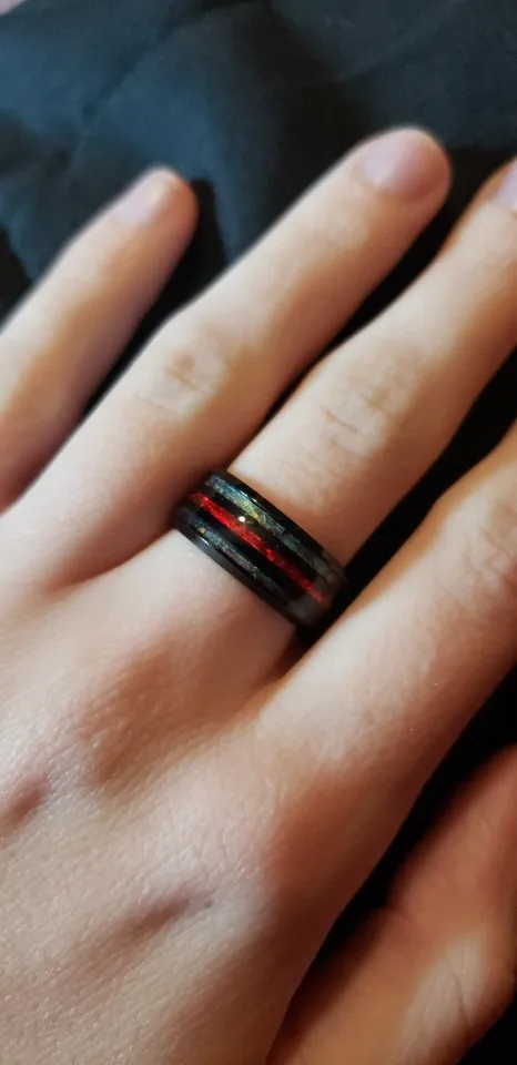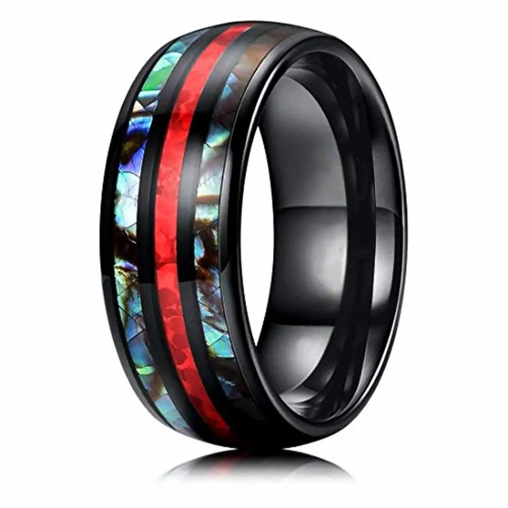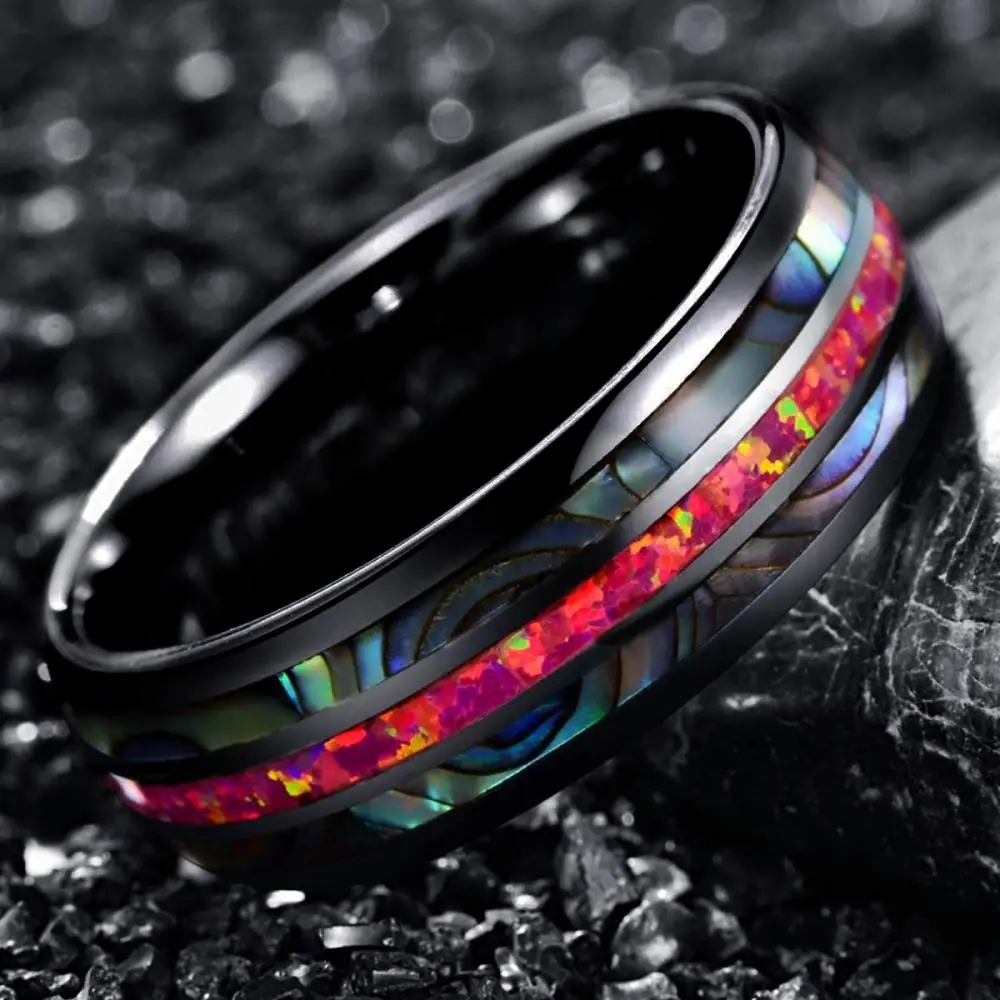 Черный 8 мм Нержавеющаясталь заполните красный огонь Имитация Опал Радужный Галиотис оболочки инкрустация Кольцо Лучшие подарки для Для мужчин обручальные кольца серебряные ювелирные изделия