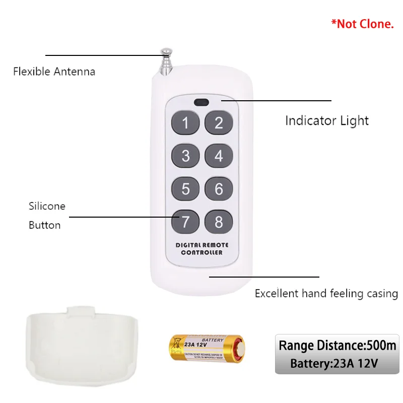 Дистанционное управлениеПараметры--Дистанция управления: 50 м-100 м (Теоретическое расстояние)-- Частота RF: 433 МГц--Поддержка кодирования: Наклонный код 1527 --Аккумулятор: 23 а, 12 В (включая аккумулятор)-- Винт: включает-- База:Включает