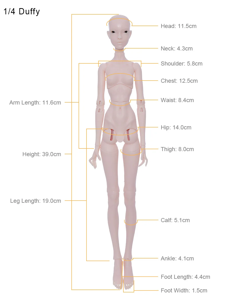 Высота: 39,0 смОкружность головы: 11,5 смОкружность шеи: 4,3 смШирина плеч: 5,8 смОбхват груди: 12,5 смОбхват талии: 8,4 смОбхват бедер: 14,0 смДлина дужки: 11,6 смДлина ноги: 19,0 смОбхват бедер: 8,0 смОбхват голенища: 5,1 смОбхват щиколотки: 4,1 смШирина стопы: 1,5 смДлина стопы: 4,4 смГлаза: 6 ммPS: из-за ручного измерения возможна погрешность в 1-3 см, пожалуйста, поймите!
