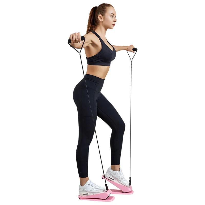 Мини-шаговый механизм с тренировочным ремнем используется для нескольких тренировок. Руки, плечи и бицепсы оснащены ремнями для упражнений. Шаговый механизм подтягивает мышцы ягодиц.