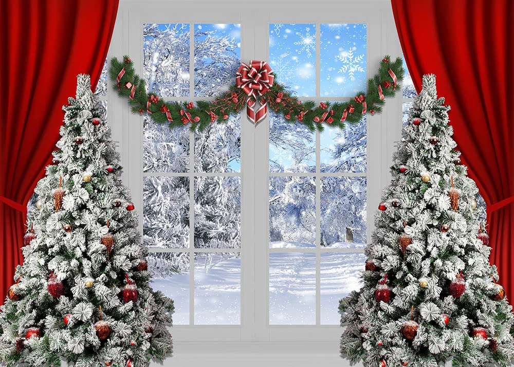 Фон для фотосъемки с изображением окон снега фотографий Красной занавески рождественской елки реквизит для портретной фотостудии с Рождеством