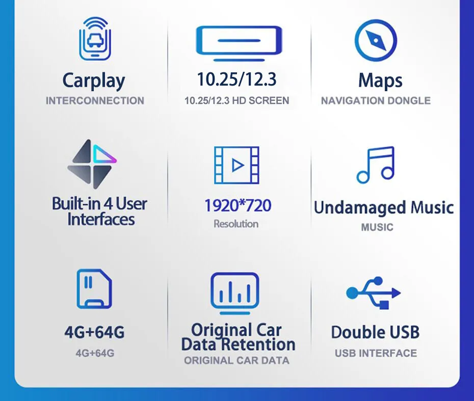 > 10,25/12,5 дюймов IPS емкостный Экран + 4 ядра/Octa Core + DDR3 2 Гб (4 Гб опционально) флэш-память + 32 ГБ памяти (64 Гб опционально) + Builtin Carplay + Builtin Wifi + 4G LTE + gps-навигация (бесплатное обновление карты) + Управление рулевым колесом + зеркальная связь + Bluetooth + Встроенный микрофон + Поддержка функции USB ADAS DVR + Функция Europe DAB + 1080P Vedio Play + HD 1280*480(1920*720 опционально) + Система контроля давления в шинах> OSD языкРусский, английский, испанский, итальянский, французский, немецкий, китайский, эстонский, польский, филиппинский, финский, корейский, голландский,Хорватский, латышский, литовский, румынский, норвежский, португальский, японский, шведский, тайский, турецкий,Украинский, венгерский.> Поддержка обслуживанияНаша цель-продолжать усердно работать, чтобы сделать инновационное оборудование и программное обеспечение автомобильного мультимедийного плеера радио, чтобы дать вам индивидуальный опыт.Мы предоставляем обновления для прошивки, программного обеспечения, gps-навигационных карт бесплатно.