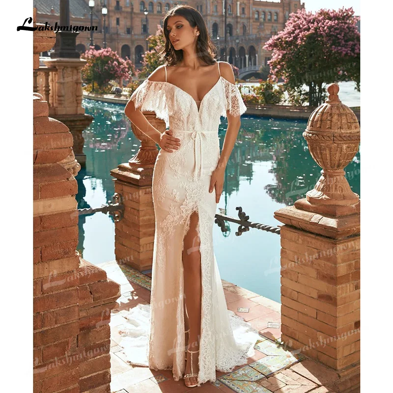 Сексуальное свадебное платье с разрезом спереди и юбкой-годе, кружевные на тонких бретельках с открытой спиной, шелковая органза, сексуальное простое платье с глубоким V-образным вырезом