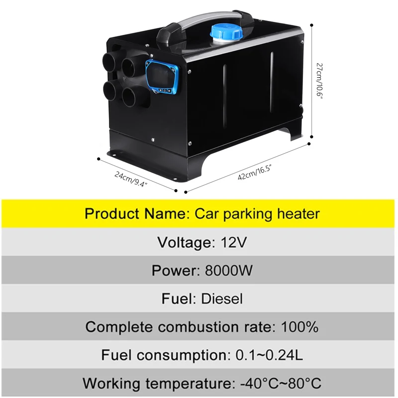 Характеристики:Материал: металлЦвет: черныйРазмер: 24 × 42 × 27 см/9,5 × 16,5 × 10,6"Напряжение:12 ВМощность:8000 ВтТопливо: ДизельПолный коэффициент сгорания: 100%Расход топлива: 0,1 ~ 0,24 лРабочая температура: -40 °C ~ 80 °CОсобенности-Все в одном блоке, экономит место и легко перемещается.-Простота установки, удаления и обслуживания.-Избавьтесь от повреждений автомобиля, вызванных резким падением температуры.-Низкий уровень шума: снижение уровня шума при минимальном уровне шума.-Простая установка: компактный дизайн хорошо подходит для использования в различных узких пространствах.-Низкое потребление топлива и энергии в течение более длительного периода эксплуатации.-Плавный, автоматический комнатный контроль температуры с предварительной установкой температуры.-С непрерывным мониторингом и диагностической системой.-Топливо поставляется из собственного бака транспортного средства.-Применимо к: различным дизельным механическим транспортным средствам, таким как автомобили, автобусы, RVs, грузовики, инженерные транспортные средства и т. д.Примечание:1. Допускается погрешность в 1-5 мм из-за ручного измерения. Перед размещением заказа, пожалуйста, внимательно ознакомитесь со всеми условиями.2. Цвета могут отличаться, так как на дисплее разница, пожалуйста, поймите.