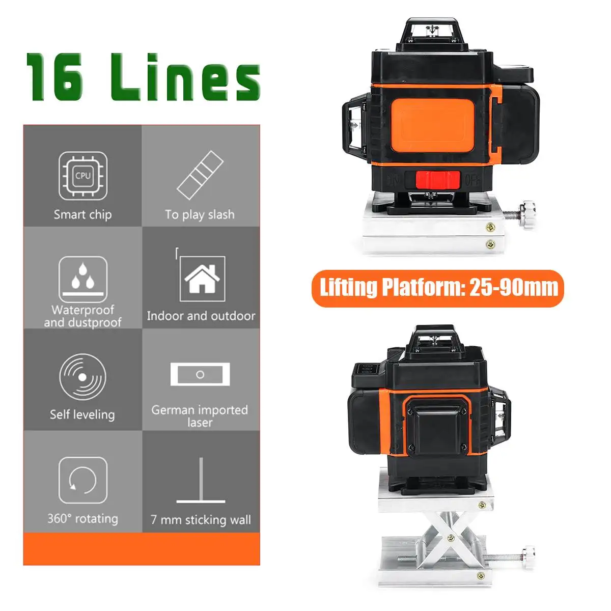 Особенности:-4D 16 линейный лазерный провод для точного позиционирования-Светодиодный дисплей-Самонивелирующаяся система-Гибкость и стабильность-Зарядка с помощью-Пульт дистанционного управления-Вращающееся на 360 ° основание с тонкой ручкой настройки, быстро идентифицирует цель-Водонепроницаемость, износостойкость и изысканность, простота в эксплуатации-Утолщенное металлическое основание обеспечивает стабильную поддержку и ударопрочность, ударопрочность-Легко носить с собой чехол, обеспечивая быструю и удобную мобильность и хранение-Широкое применение для вспомогательной фиксации плитки, украшения стен, фиксации напольной плитки, лестничных поручней и многого другогоХарактеристики:-Светильник: зеленый светильник-Линия: 16 линий-Лазерный светильник: 360 ° x4, 16 линий-Подъемная платформа: 25-90 мм-Расстояние дистанционного управления: 10 м-Лазерный светильник источник: длина волны лазера 808nm, зеленый светильник-Точность по горизонтали/вертикали: ± 1 мм/7 м-Диапазон автоматического выравнивания: ± 3 °-Класс водонепроницаемости: IP-54-Рабочий диапазон: около 15 м в диаметре-Зеленый светильник, Рабочая температура: -10 ℃ ~ 50 ℃-Непрерывное время работы: около 8 ~ 12 часов-Мощность: AC 110-240 в зарядное устройство-Емкость аккумулятора: 6000 мАч