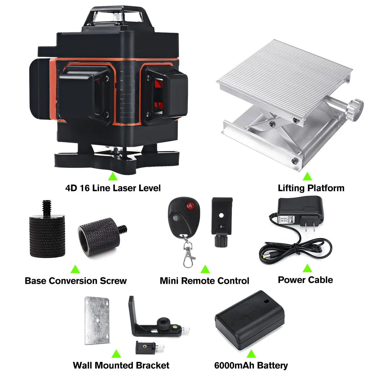 Посылка включает в себя:1x 3D/4D 12/16 линейный лазерный уровень1 подъемная платформа1x Мини-пульт дистанционного управления1x аккумулятор2x настенный кронштейн (разный размер)1x Кабель питания1x руководство на английском языке