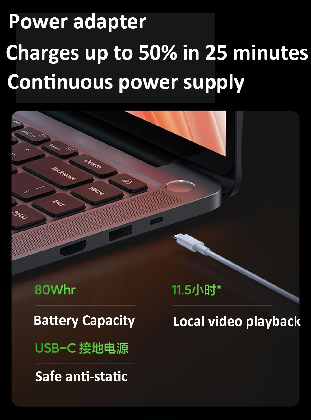 80 Вт * ч (номинальное число) емкость батареи, 130W USB-C адаптер питания, 11,5 часов локального воспроизведения видео * 25 минут до 50% заряда *