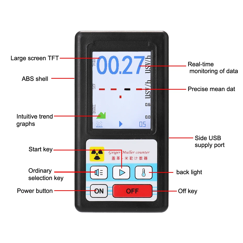 ☞Высокая чувствительность, широкий диапазон измерений, долговечные преимущества. Ежедневное использование детектора ядерной радиации помогает избежать радиационных опасностей в повседневной жизни.