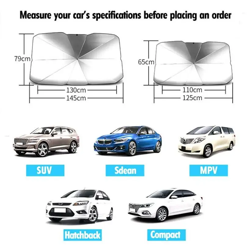1. Высококачественные материалы с следующими функциями: износостойкость, устойчивость к старению и ударопрочность. 2. Новый стиль затенения. Дизайн зонта, эластичный дизайн, маленький размер, легко носить с собой. 3. Фокусировка на анти-ультрафиолетовых лучах и понижение температуры внутри автомобиля летом