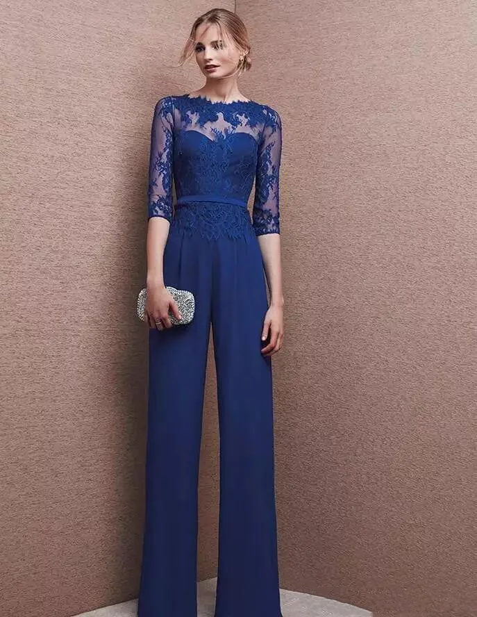 Женский шифоновый костюм для матери невесты, темно-синий брючный костюм с кружевными рукавами, коктейльное вечернее платье, 2021, размера плюс