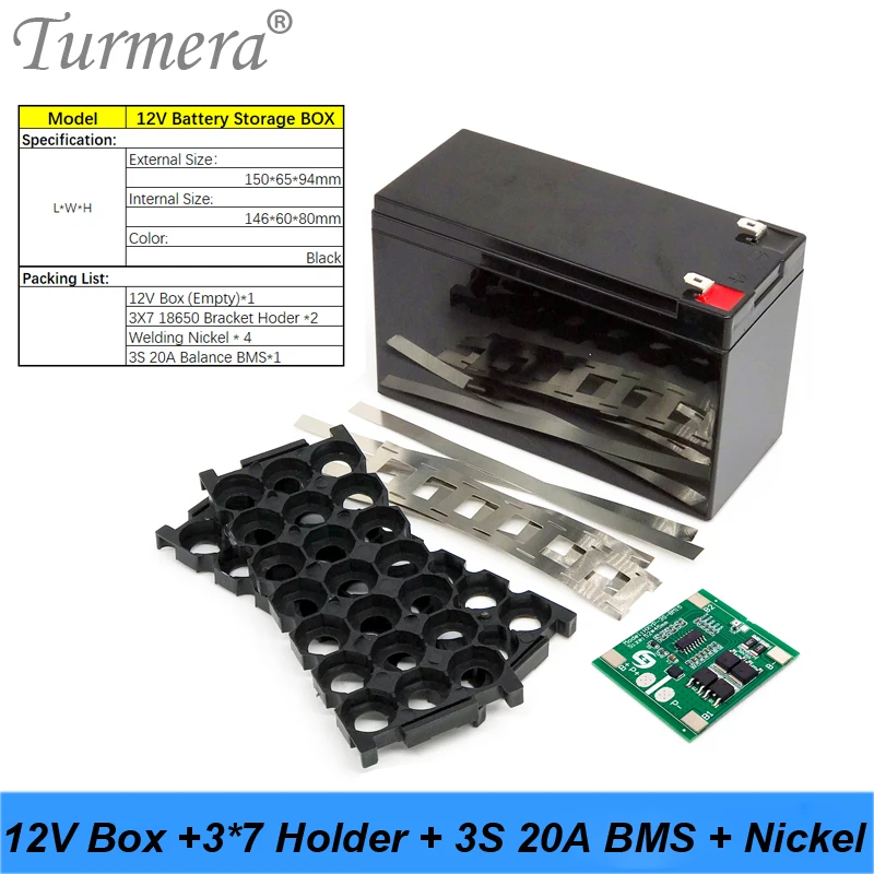 Коробка для хранения аккумуляторов Turmera, 12 В, 7 А ч, 20 А ч, 3x7, 18650, 3S, 20A, BMS, сменный никель для свинцово-кислотного аккумулятора мотоцикла