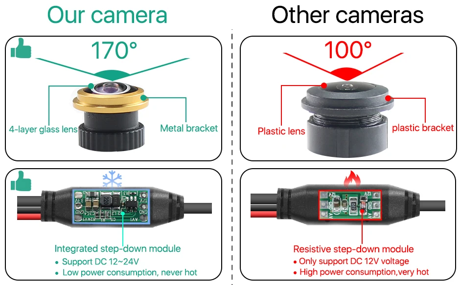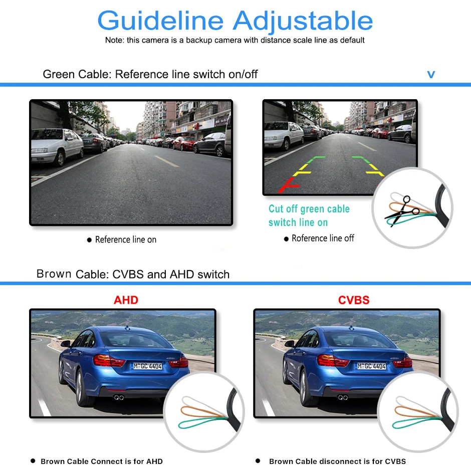 * AHD 720P Автомобильная Передняя Задняя боковая камера --- разрешение 1280*720P, высокая четкость, угол обзора 170 градусов, не беспокойтесь о зоне слепых зон, водонепроницаемость IP68, работает должным образом при стирке автомобиля или плохой погоде, фантастический эффект ночного видения. * Поддержка AHD и CVBS видеосигнала --- эта Автомобильная камера заднего вида может работать как с AHD мониторами, так и с AHD мониторами. Его Выходной видеосигнал AHD по умолчанию, если вам нужно его подключить к монитору CVBS, пожалуйста, обрежьте коричневый кабель на камере и повторно подключите к источнику питания. * Направляющая линия ВКЛ или ВЫКЛ регулируется --- на этой обратной камере есть небольшая зеленая петля переключения. Когда вы получите его, он по умолчанию имеет направляющую линию. Если вам не нужна Направляющая линия, отрежьте зеленую петлю и повторно подключите к источнику питания. * Внимание --- согласно нашему опыту, некоторые дешевые головки Android имеют настройки для AHD видеосигнала, но правда в том, что они не могут отображать изображение AHD, потому что они вообще не поддерживают AHD. Если да, то Вы можете применить только видеосигнал CVBS, надеюсь, вы понимаете