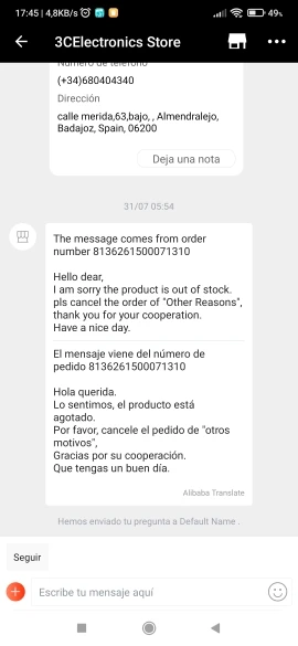 El vendedor no tenia stock y queria que cancelara el pedido poniendo otros motivos, ahora que aliexpress ha intervenido y me ha reembolsado el dinero, el vendedor quiere que le de 4-5 estrellas y dice que me hara un descuento para la proxima compra. Señor vendedor, hagase responsable cuando debe, no cuando ya interviene aliexpress