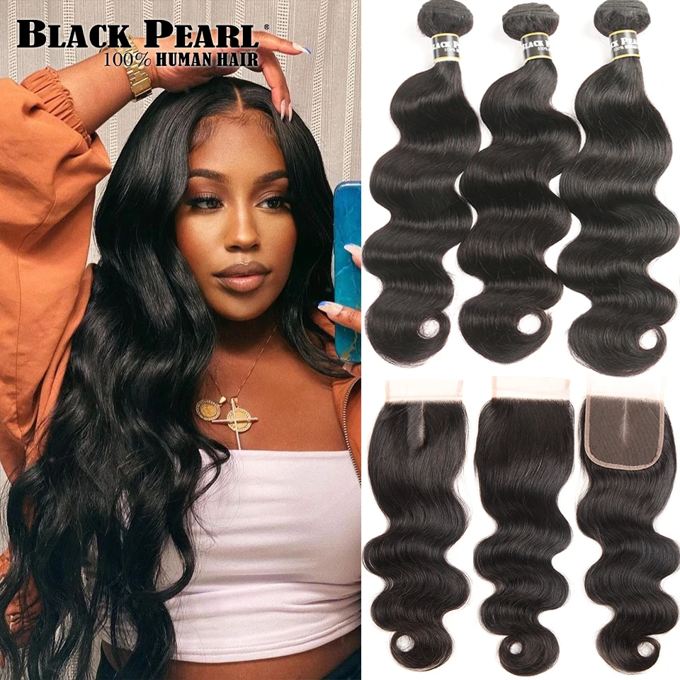 Черный жемчуг 30 дюймов бразильские волнистые пряди с закрытием 8-34 дюймов бразильские Реми человеческие волосы плетение 3 4 пряди с закрытием