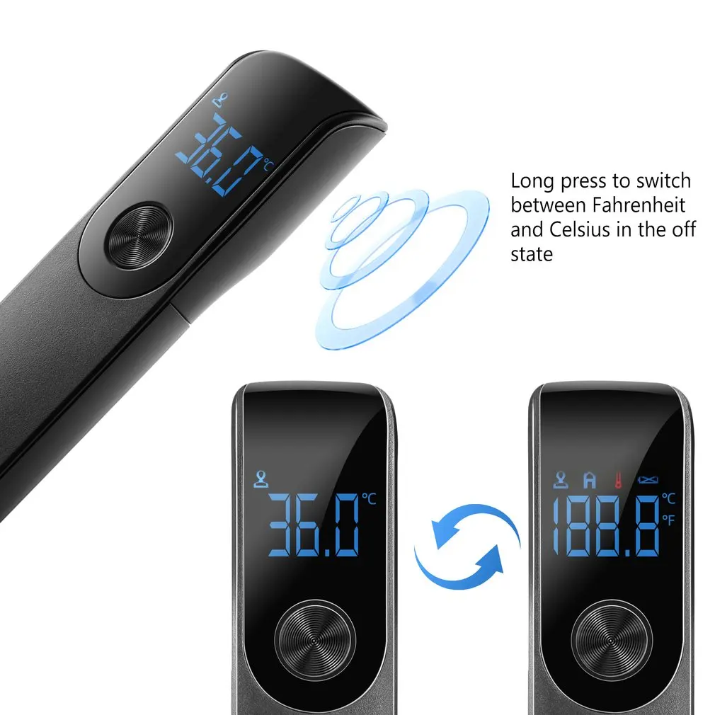 1. Быстрое измерение температуры за одну секунду: простое и удобное измерение температуры через лоб, Этот термометр практичный и точный. Существует также высокотемпературная сигнализация, указывающая на высокие температурные отклонения, и будильник отправит предупреждение didi.