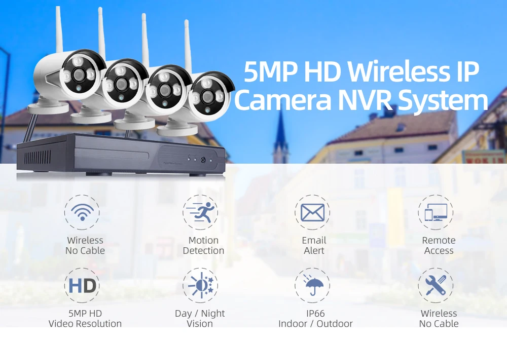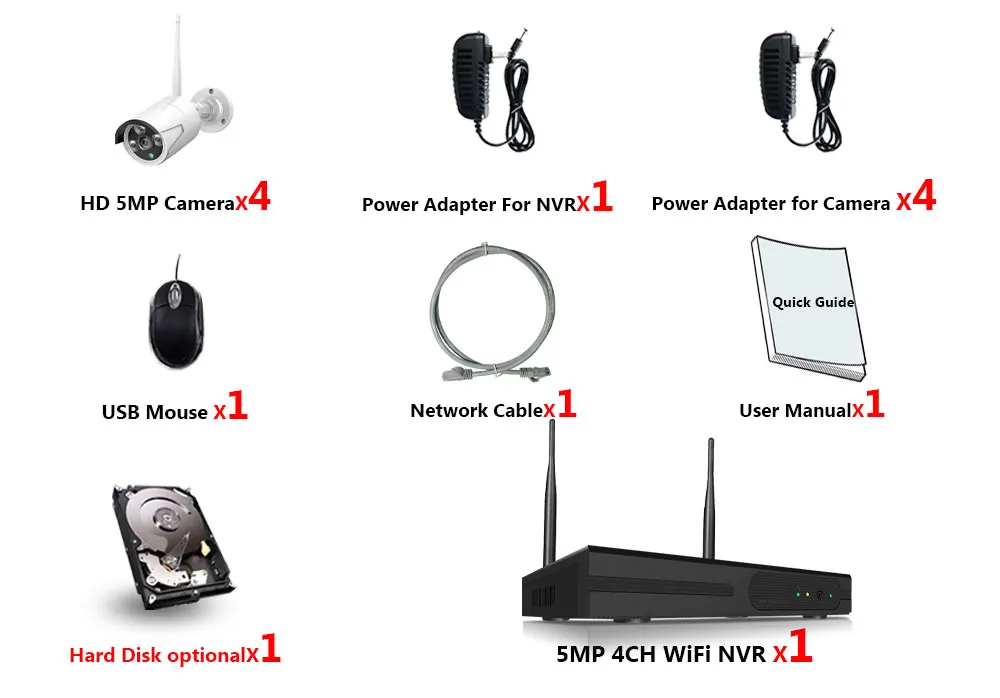 1x 4CH 5MP Беспроводной NVR 4x пулевые камеры 4x источник питания для камеры 1x источник питания для NVR 1x USB мышь (подарок) 1x 3 фута 1 м Ethernet кабель (подарок) 1x быстрая направляющая