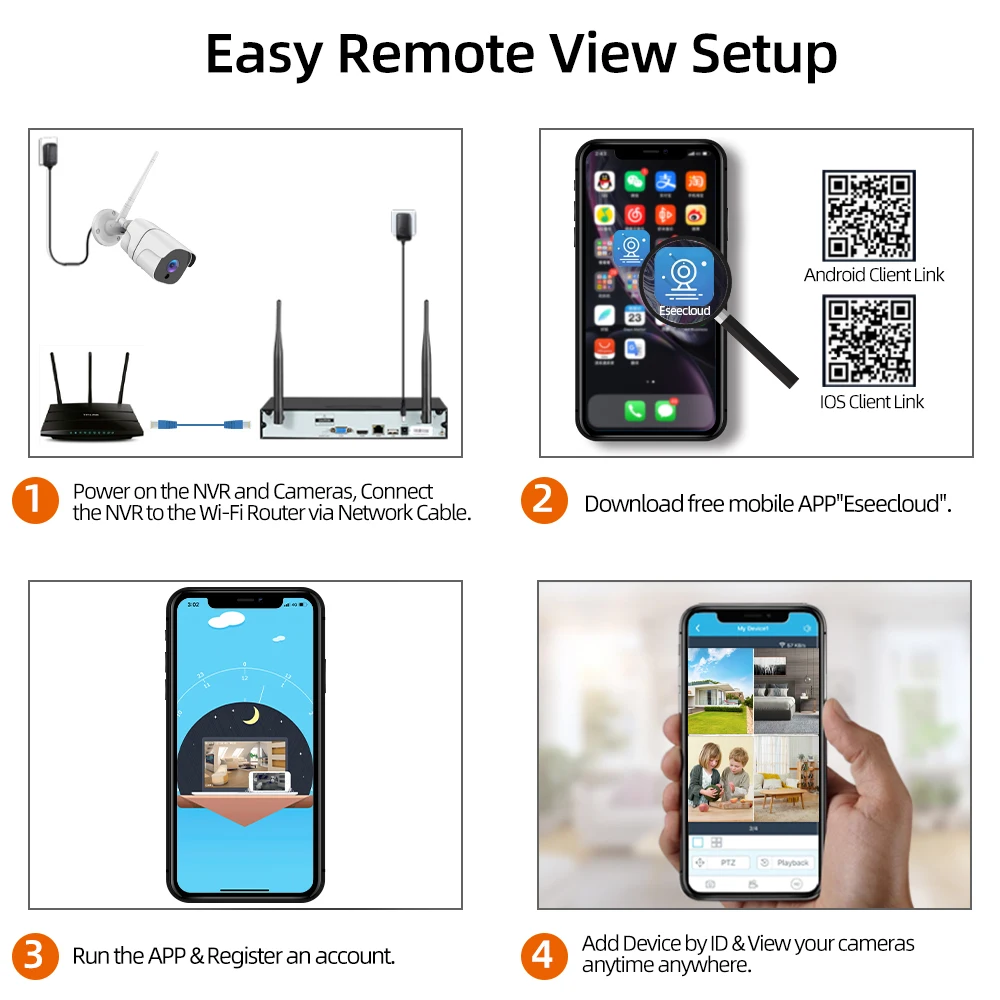 Простая настройка, всего 4 шага для просмотра мобильный телефон, просмотра видео в режиме реального времени из любого места и в любое время с помощью смартфона, стола или ПК с передовой технологией P2P, вы можете получить удаленный доступ к вашей системе за считанные минуты или меньше, нет необходимости в переадресации, удаленный доступ никогда не был таким простым!