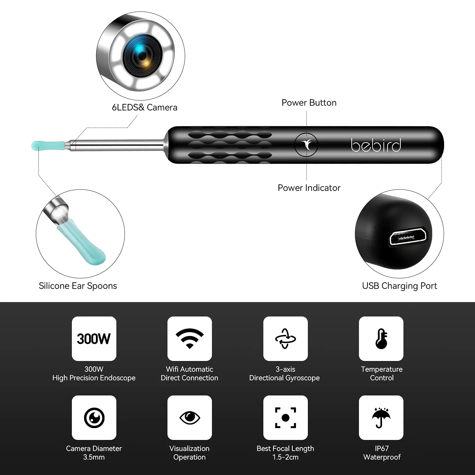Новое обновление ультра-тонкая смарт-очиститель для ушей: R3 беспроводной ушной серы удаление инструмент состоит из 4,1 мм ультра-тонкий эндоскоп внешняя трубка для переключателя скоростей, самые последние Диаметр 3,5 мм для чистки ушей, камера, И нескользящий корпус. Решить проблемы других инструментов для удаления воска BEBIRD ear с большим внешним диаметром трубки, трудностью проникновения в ушной канал, барабанной перепонкой и сложностью вращения и т. д.