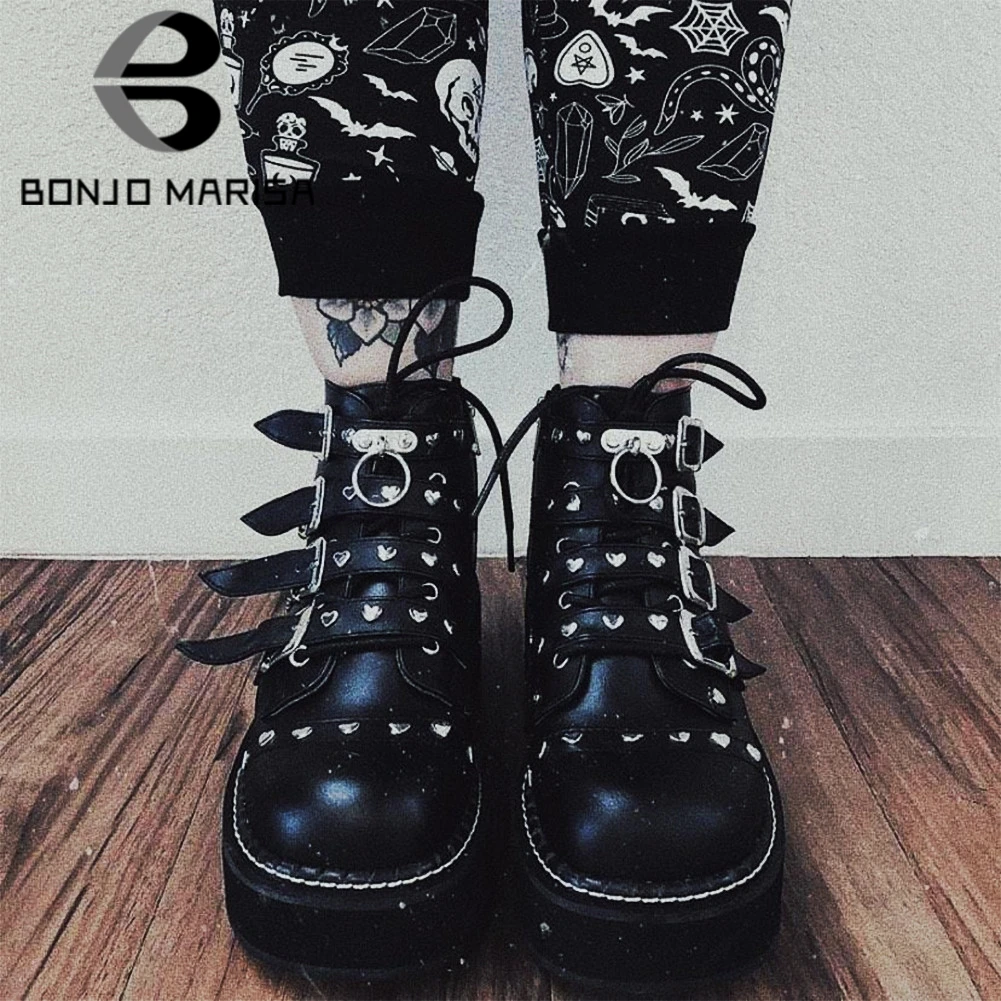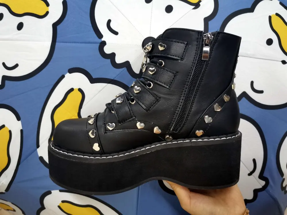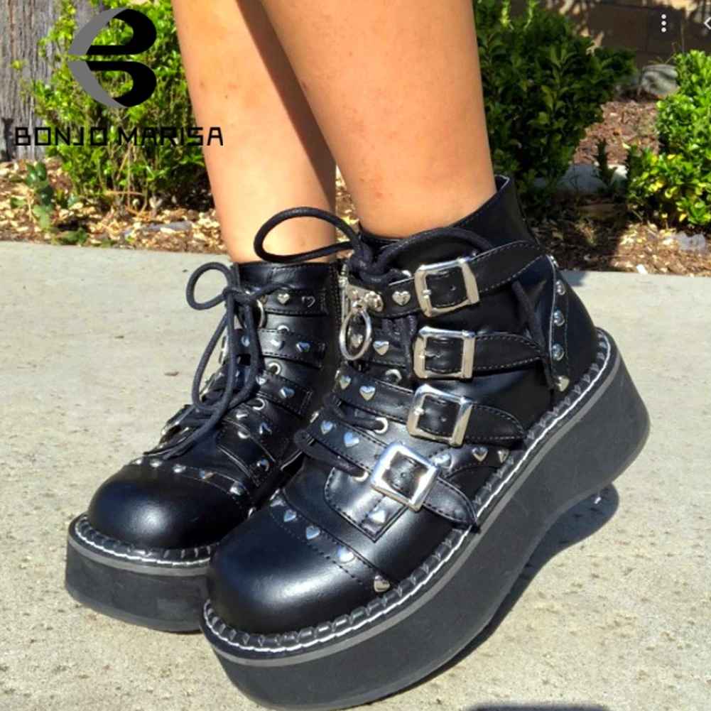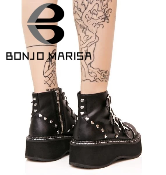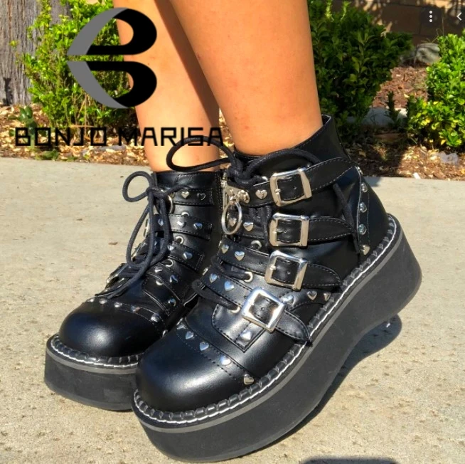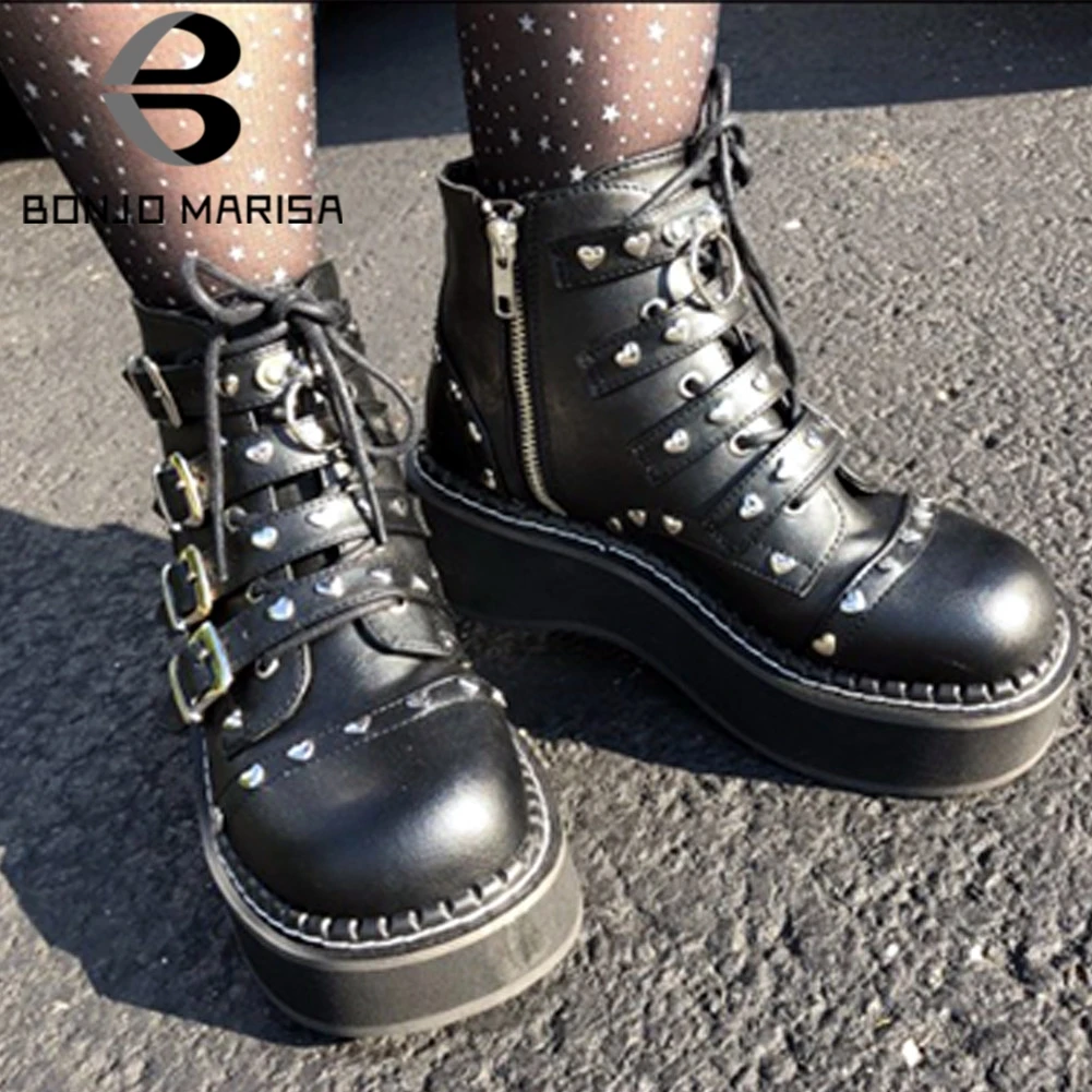 Ботильоны BONJOMARISA на платформе и танкетке, крутые модные мотоботинки в стиле панк, на шнуровке, с уличным декором сердечек, большие размеры 43