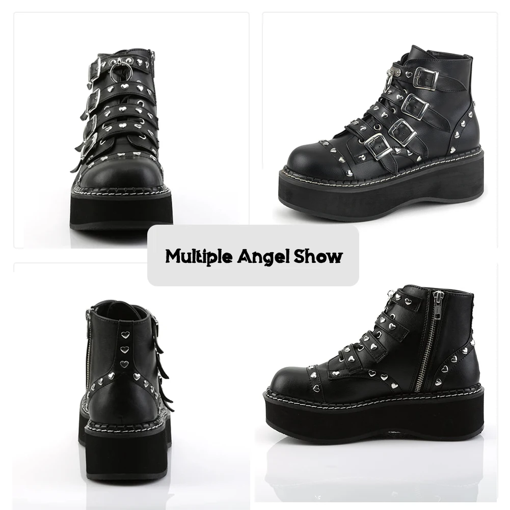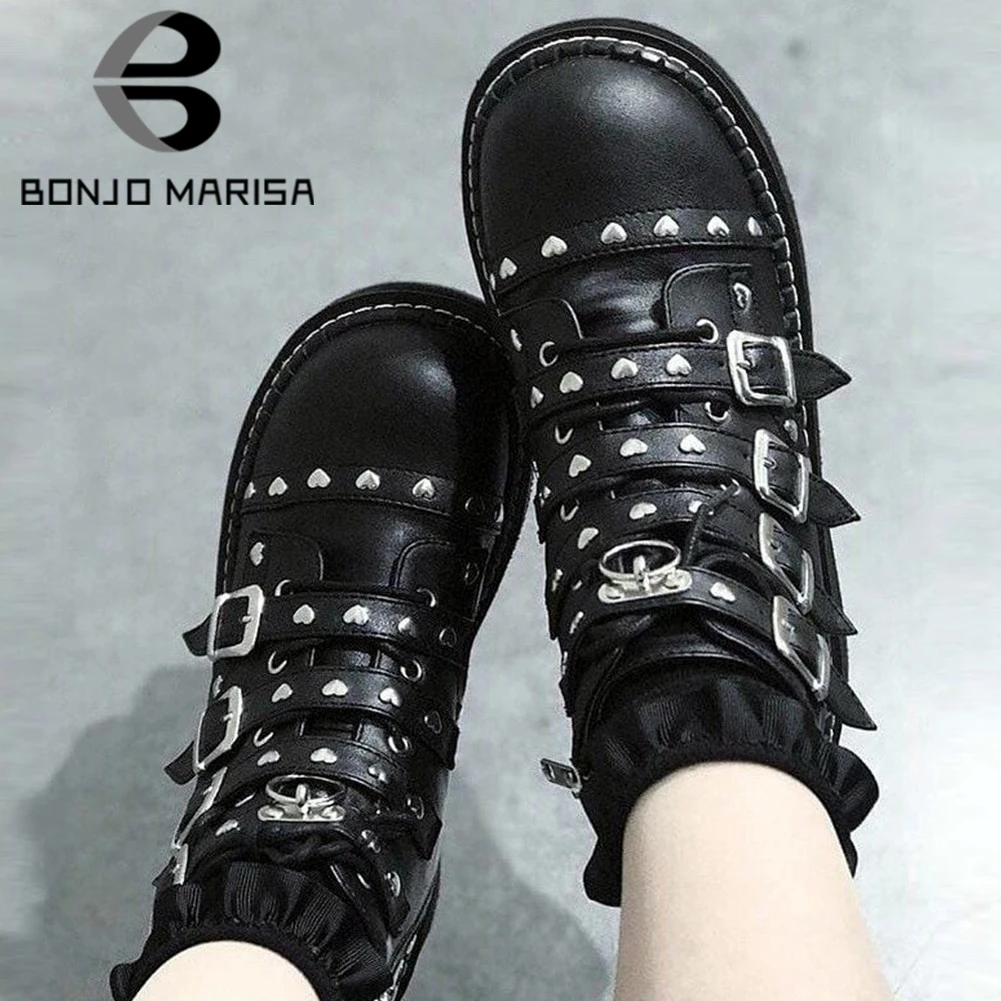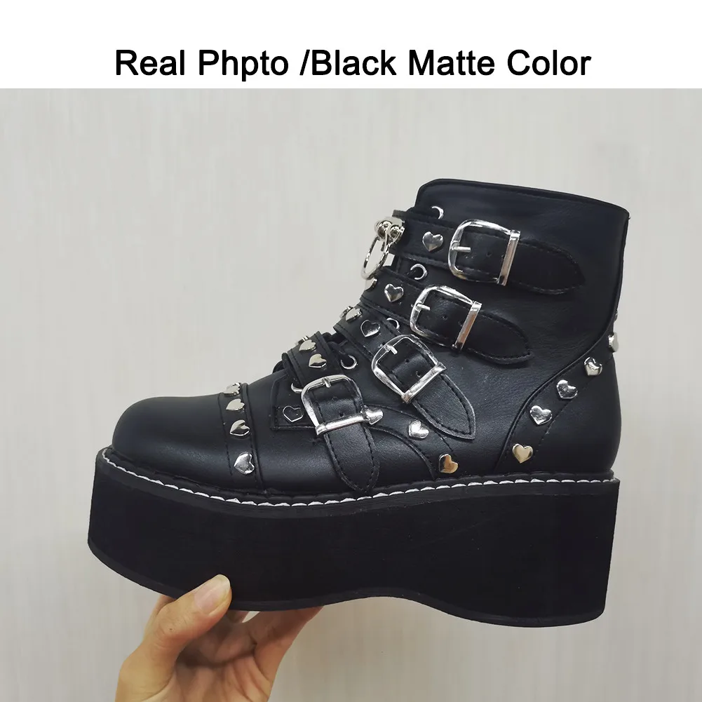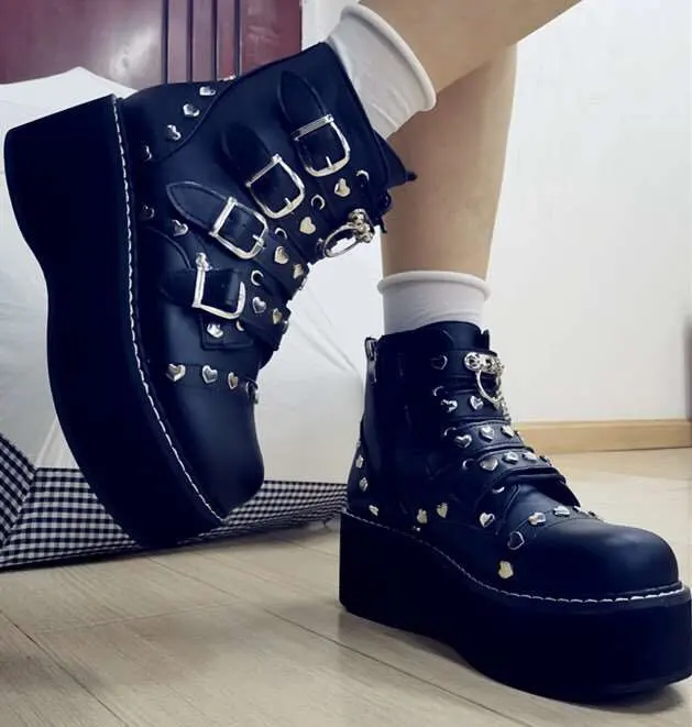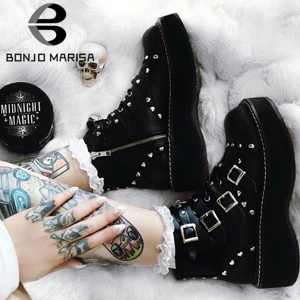 Ботильоны BONJOMARISA на платформе и танкетке, крутые модные мотоботинки в стиле панк, на шнуровке, с уличным декором сердечек, большие размеры 43