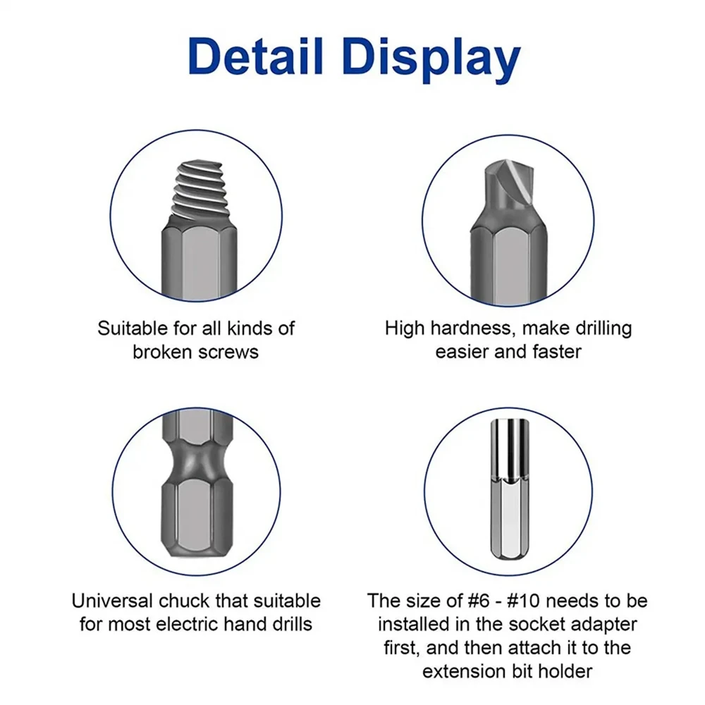 Материал: винтовой экстрактор изготовлен из высокоскоростной стали. Высокая твердость, долговечность и простота снятия поврежденных винтов.