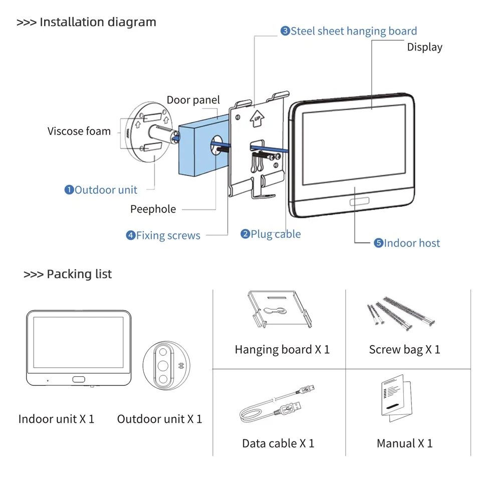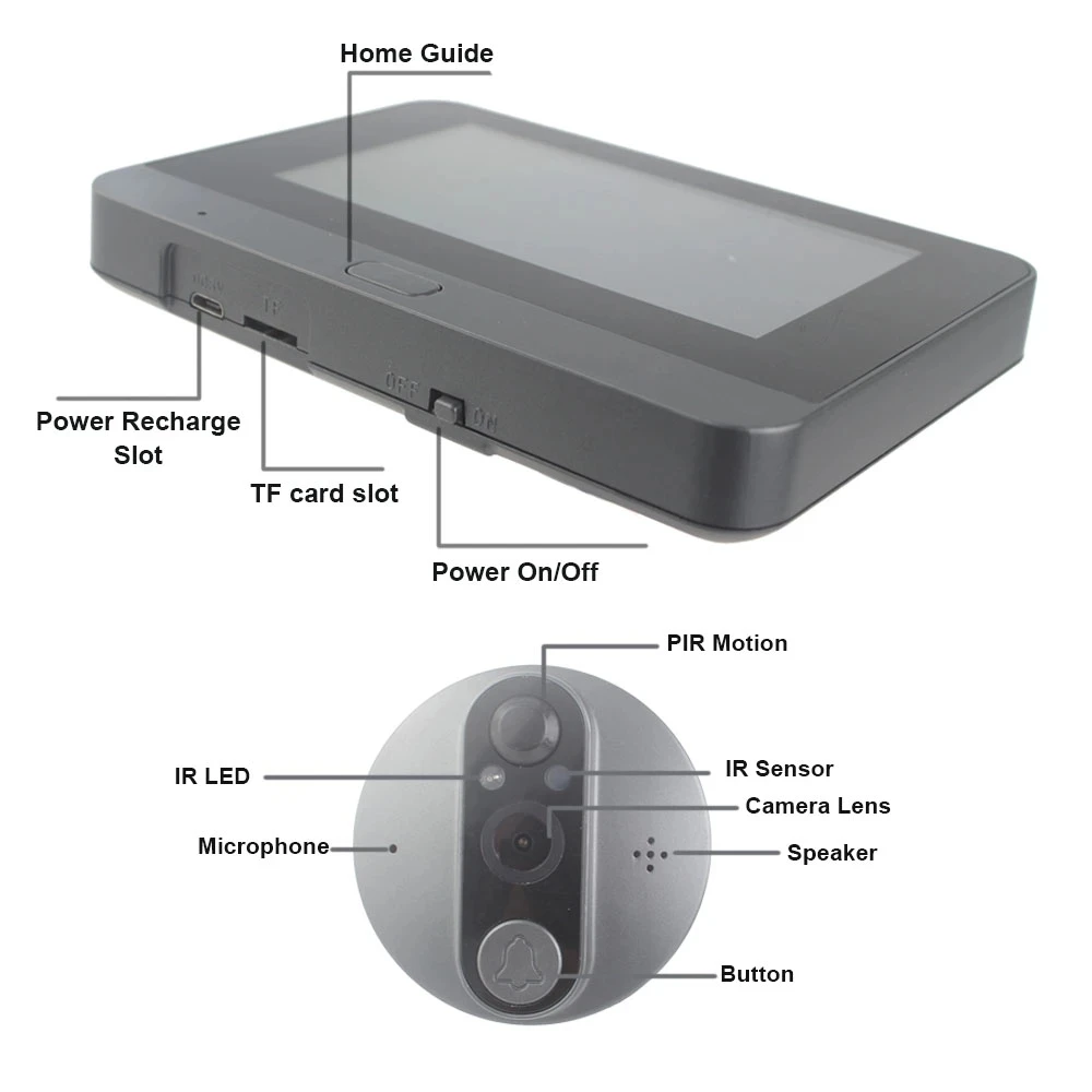 Характеристики:-Источник питания: перезаряжаемый литий-ионный аккумулятор 5000 мАч (встроенный), нормальное использование (3-5 раз в день) около 30 дней в режиме ожидания. Напоминание в режиме реального времени, когда мощность аккумулятора составляет менее 5%, устройство подскажет низкую батарею, приложение с низким аккумулятором не может связать устройство-Разрешение камеры: 1 миллион пикселей, разрешение 1280*720-Угол обзора камеры: 120 градусов-Дисплей: 4,3 дюймов TFT цветной ЖК-дисплей экран-Приложение: Watch Home/ Tuyasmart-Время реакции датчика движения: низкая чувствительность, middel чувствительность, высокая чувствительность опционально в приложении, высокая чувствительность около 1-3 секунд задержки-Формат фото: JPG-Формат видео:. Avi (нужна TF карта) или купить облачный сервис-Карта памяти: до 64 ГБ-Датчик движения определяет расстояние около 2 метров-Толщина двери: 35-115 мм (Пожалуйста, измерьте толщину двери перед покупкой)-Диаметр глазка: 15-60 мм-Дверной звонок: Да-Рабочая температура: от-20 ℃ до 55 ℃-Вес брутто: около 600 гПосылка:1 x Экран1 х дверной Звонок1 x настенный светильник1 х USB кабель6 x винтовой стержень1 х Руководство