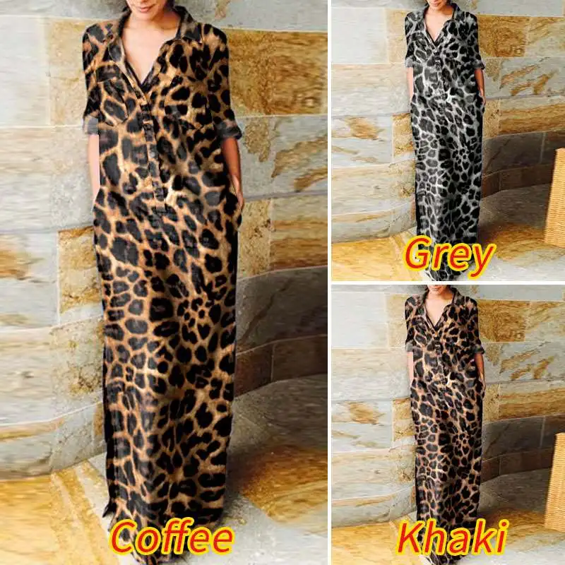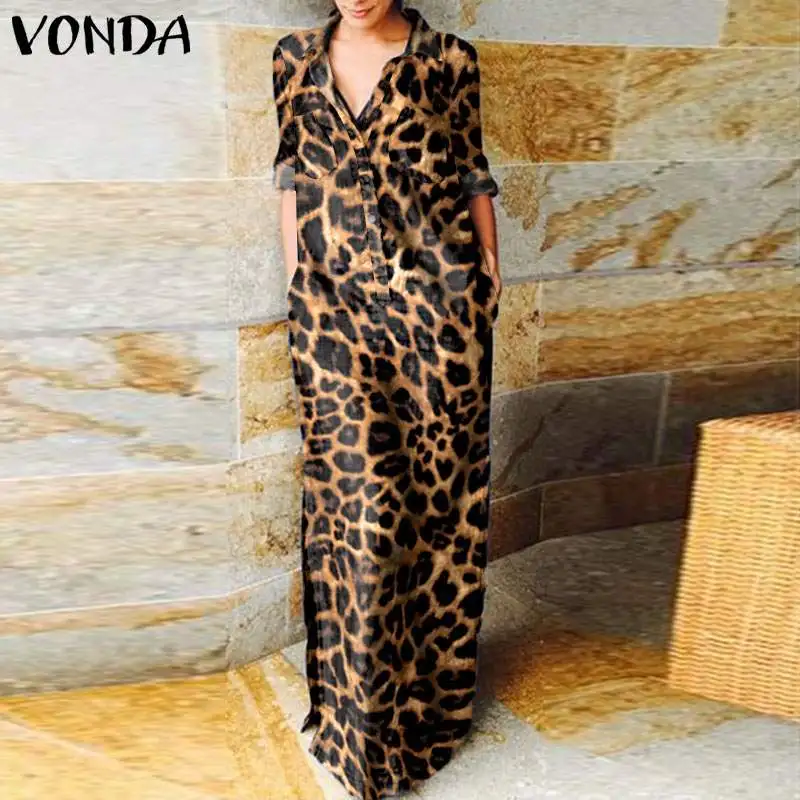 Женское платье с леопардовым принтом VONDA 2022, винтажное длинное платье с длинным рукавом, воротником с лацканами для вечеринки, Повседневное платье большого размера