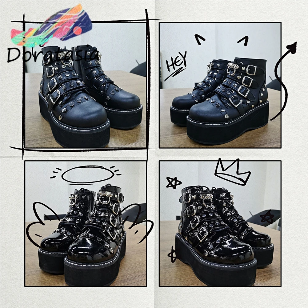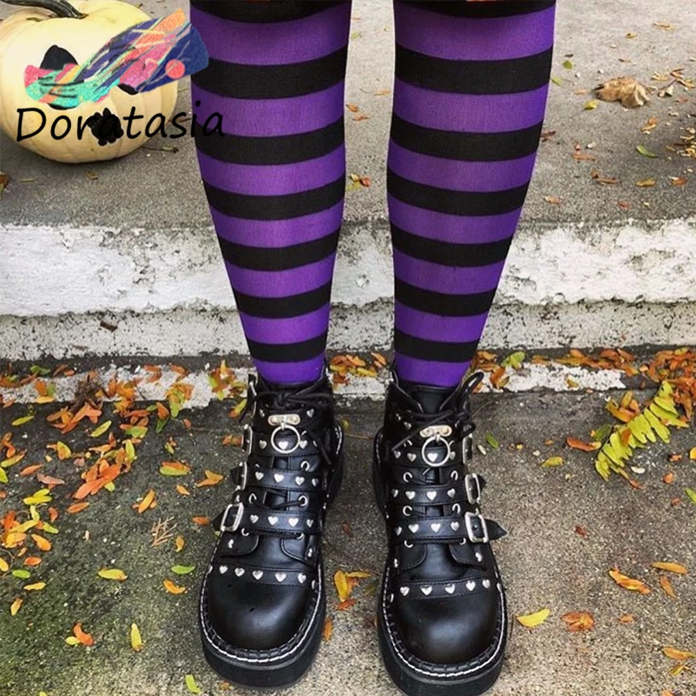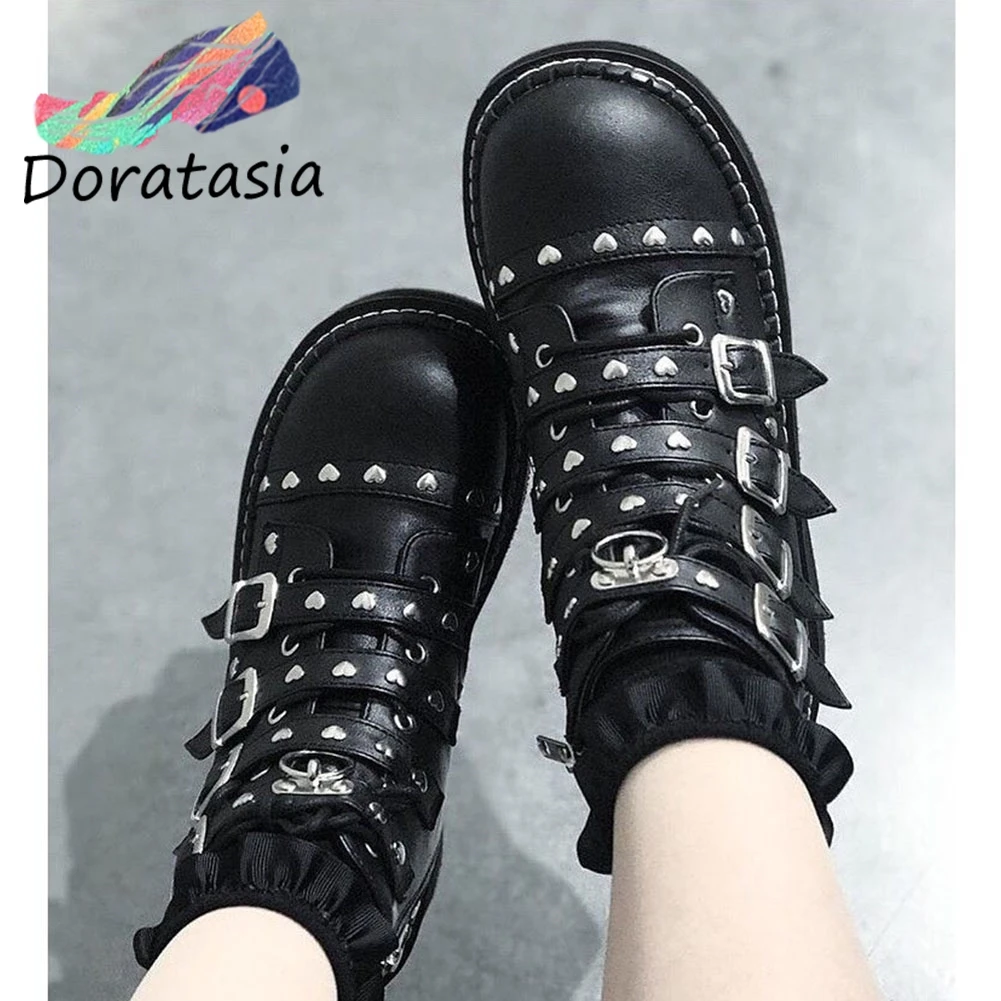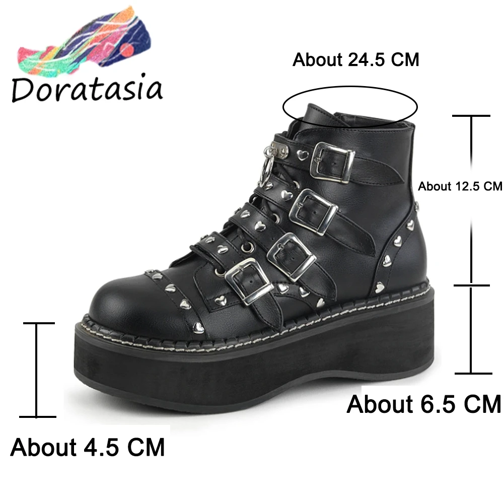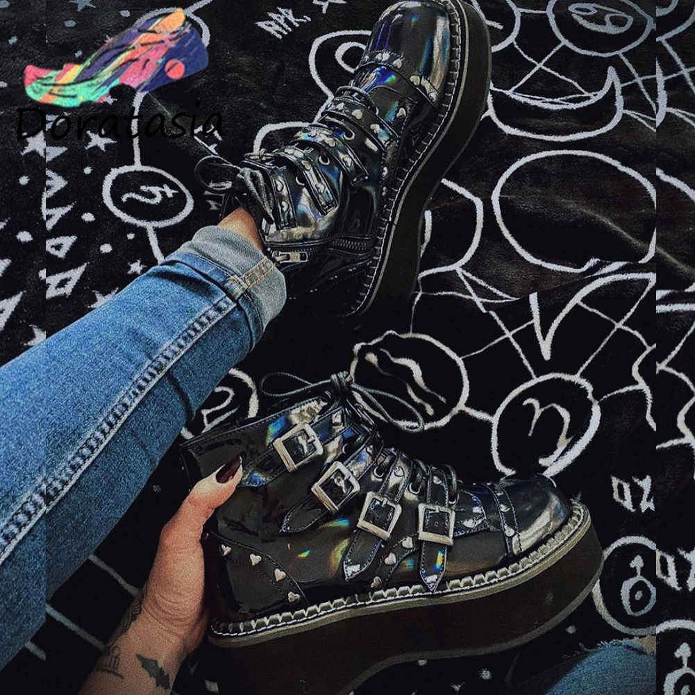 DORATASIA/Новинка; Брендовые женские уличные ботинки с пряжкой; Женские ботинки на платформе со шнуровкой на молнии с украшением в виде сердца; Повседневная обувь в стиле панк