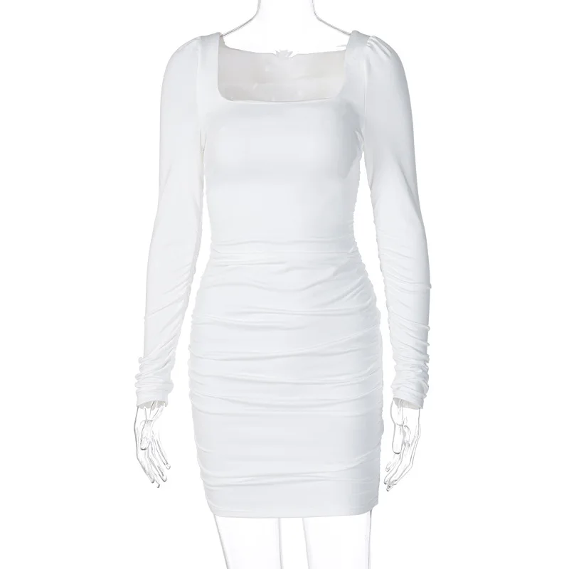 Женское Повседневное платье с длинным рукавом, Осеннее женское однотонное Плиссированное облегающее короткое платье с квадратным воротником, белого, черного, синего, коричневого цветов