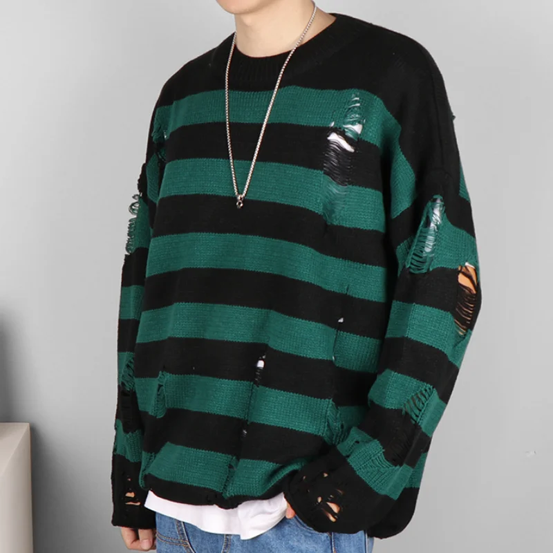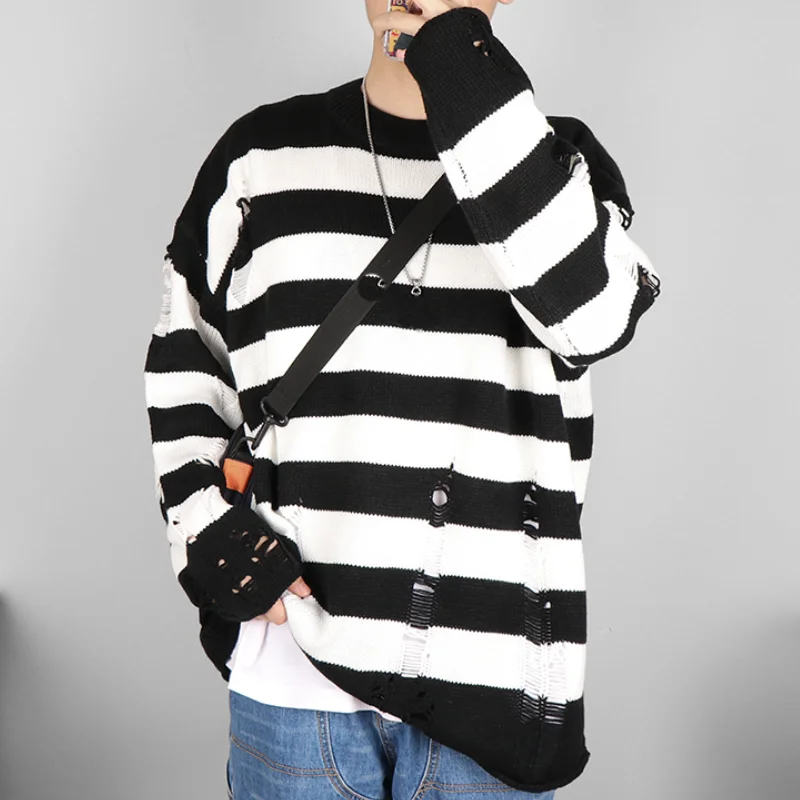 Мужские свитера в черную полоску, рваные свитера, пуловер с дырками...