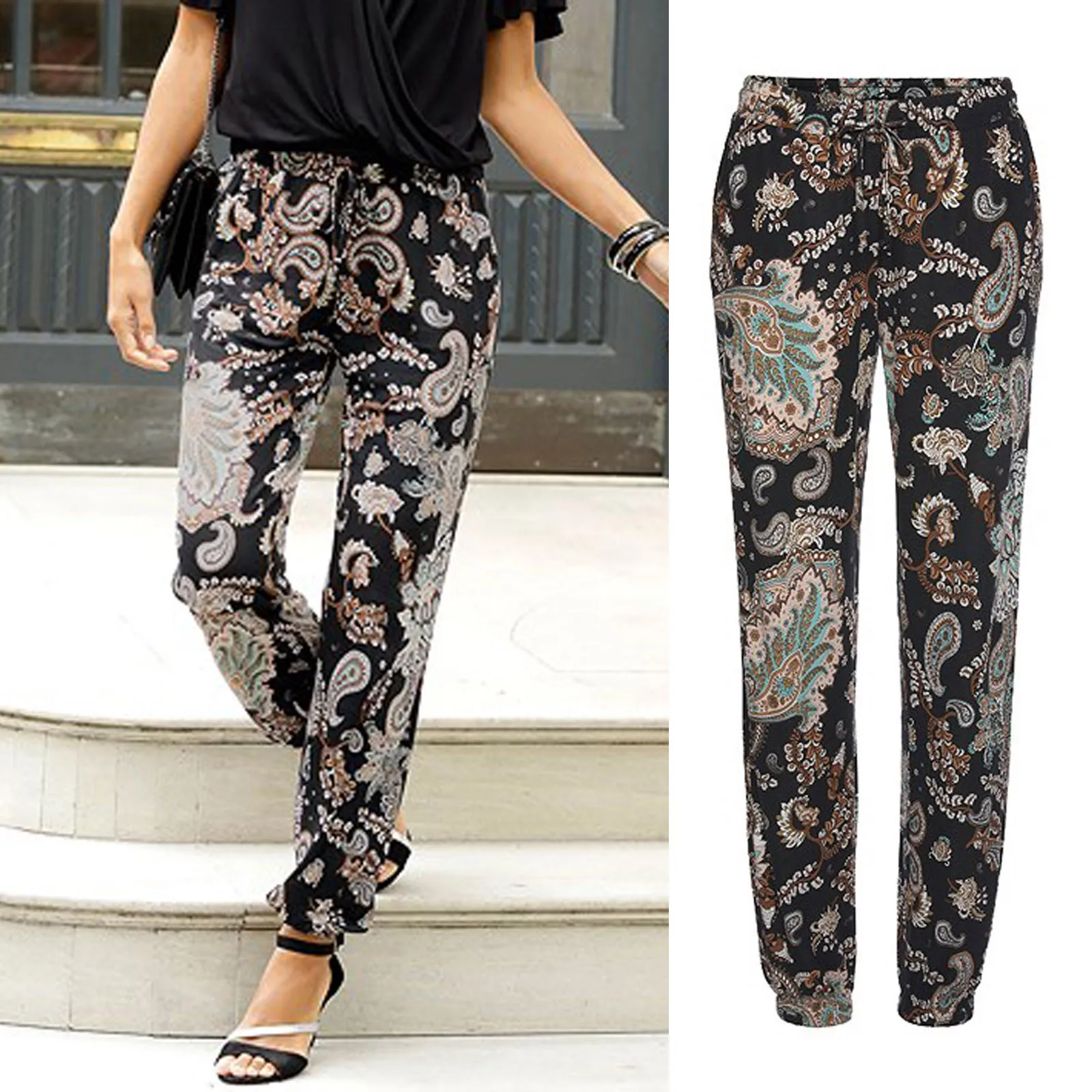 Женские брюки с высокой талией и принтом, длинные брюки в стиле бохо, пляжные брюки с карманами