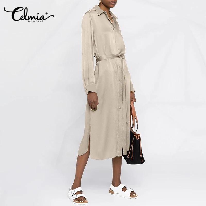 Женское элегантное атласное шелковое офисное платье миди с поясом Celmia, Повседневное платье-рубашка с отложным воротником и длинным рукавом, платье с разрезом и подолом, 2021