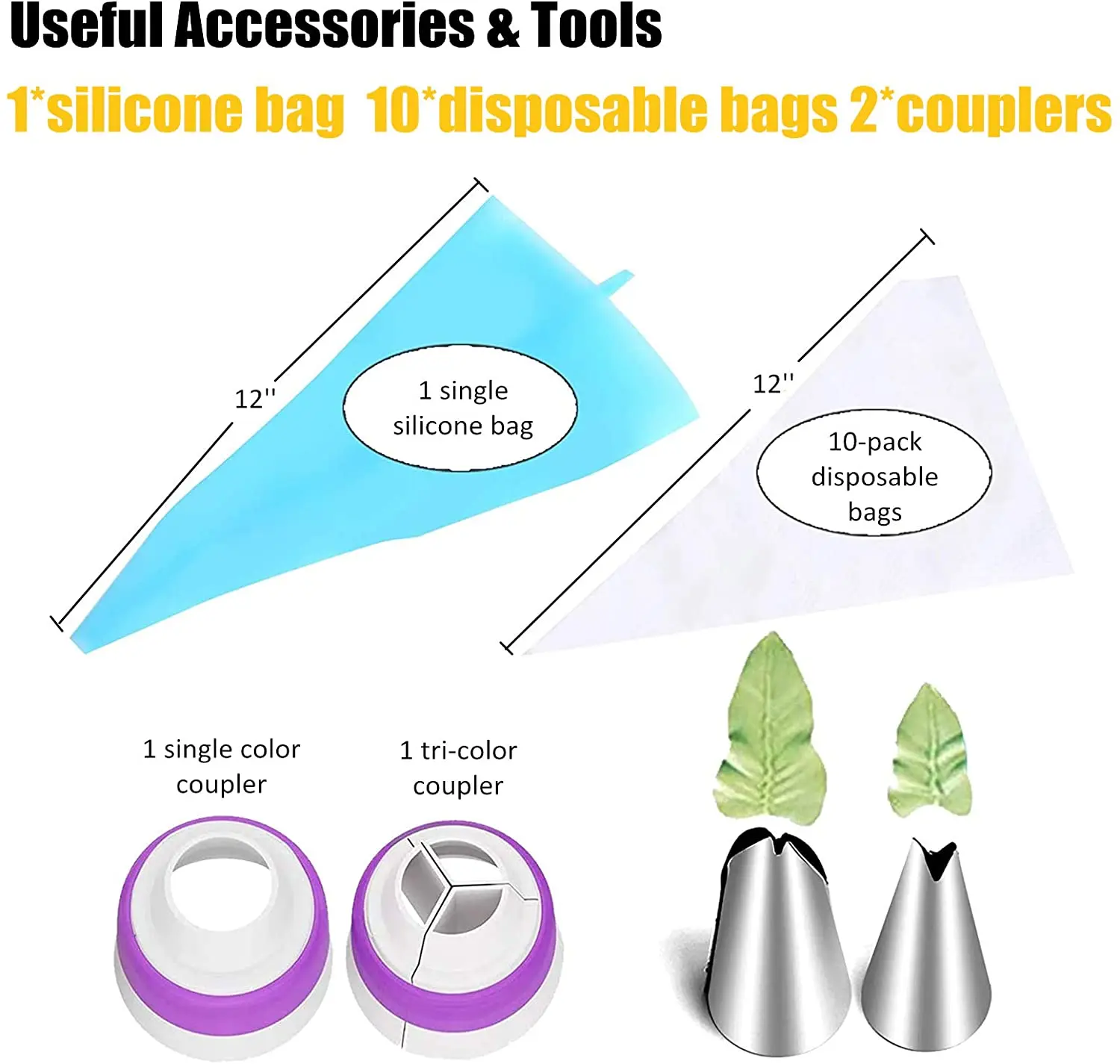 Полезные аксессуары инструменты:Кондитерские мешки, подходят к любым стандартным наконечникам трубопроводов, просто обрежьте конец кондитерского мешка, чтобы соответствовать вашим декоративным наконечникам и муфтам, отлично подходит для захвата и приятно обрабатывать. Муфта, обмен наконечниками без замены мешков для трубопроводов. Трехцветная муфта, сочетает в себе различные icings для создания веселых трехцветных завитков на ваших десертах.