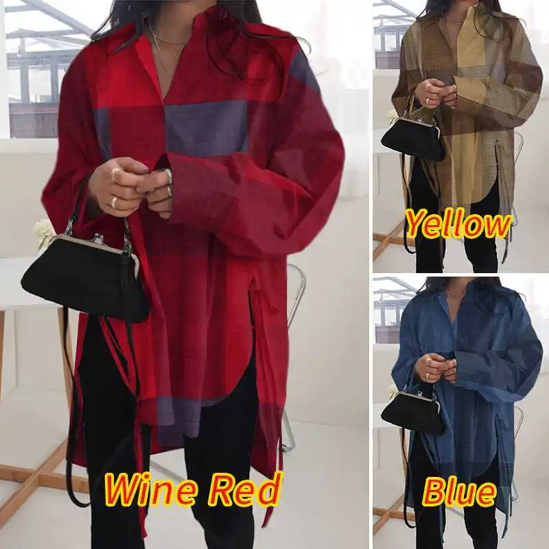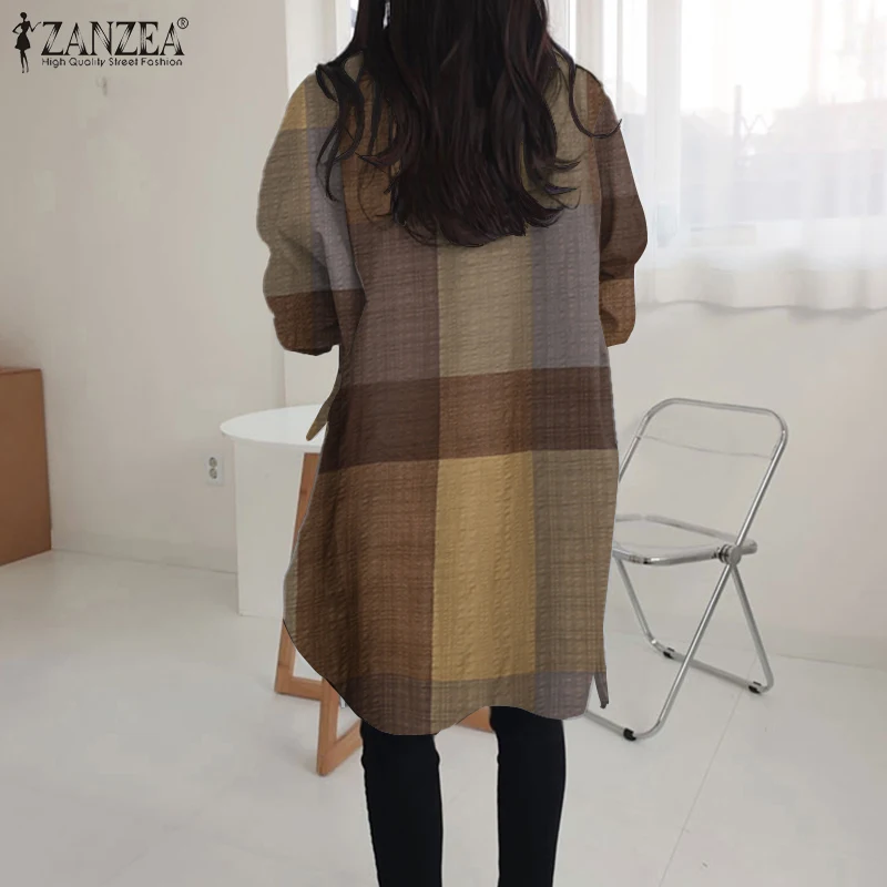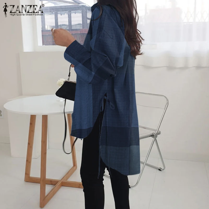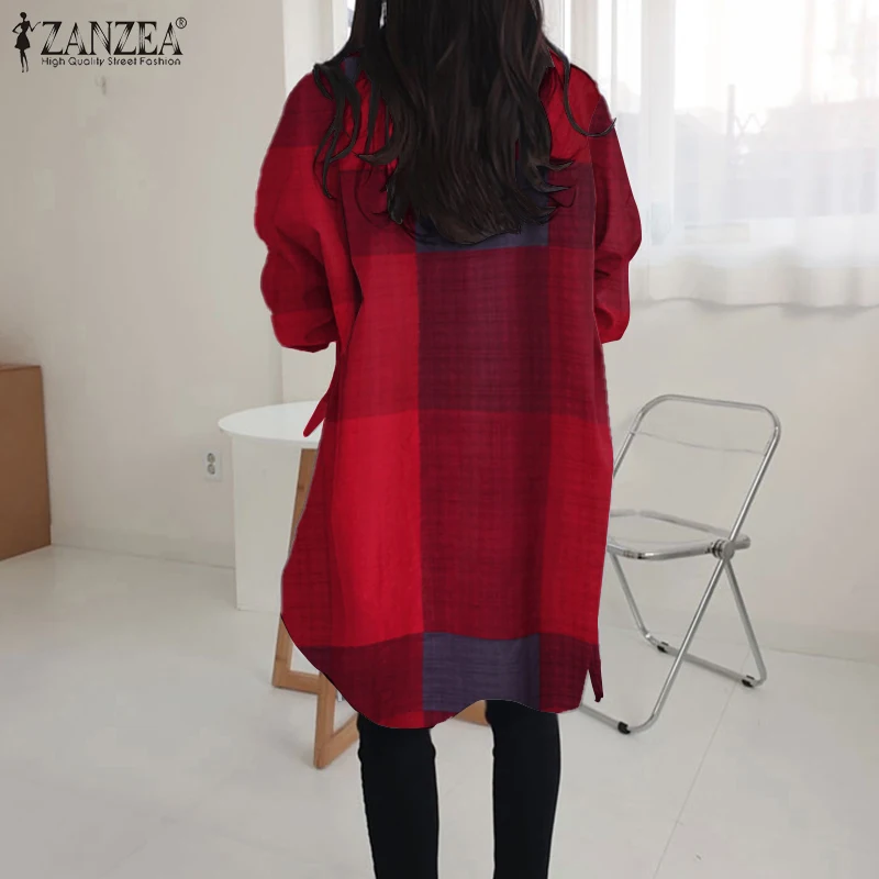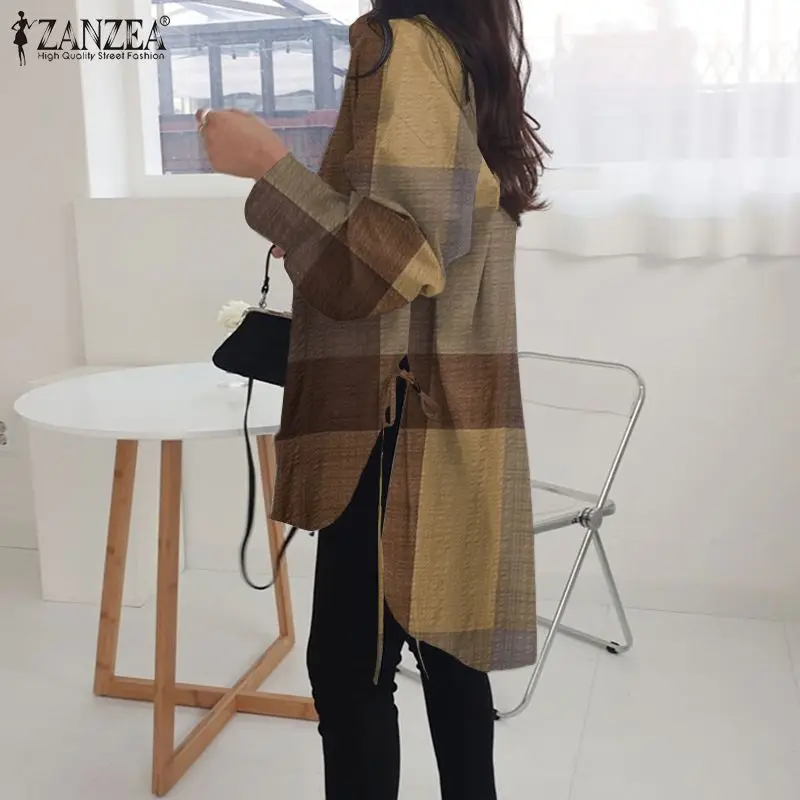 Женская винтажная клетчатая блузка ZANZEA в клетку, Летняя Повседневная рубашка с отложным воротником и длинным рукавом, асимметричные топы, туника, блузы на пуговицах