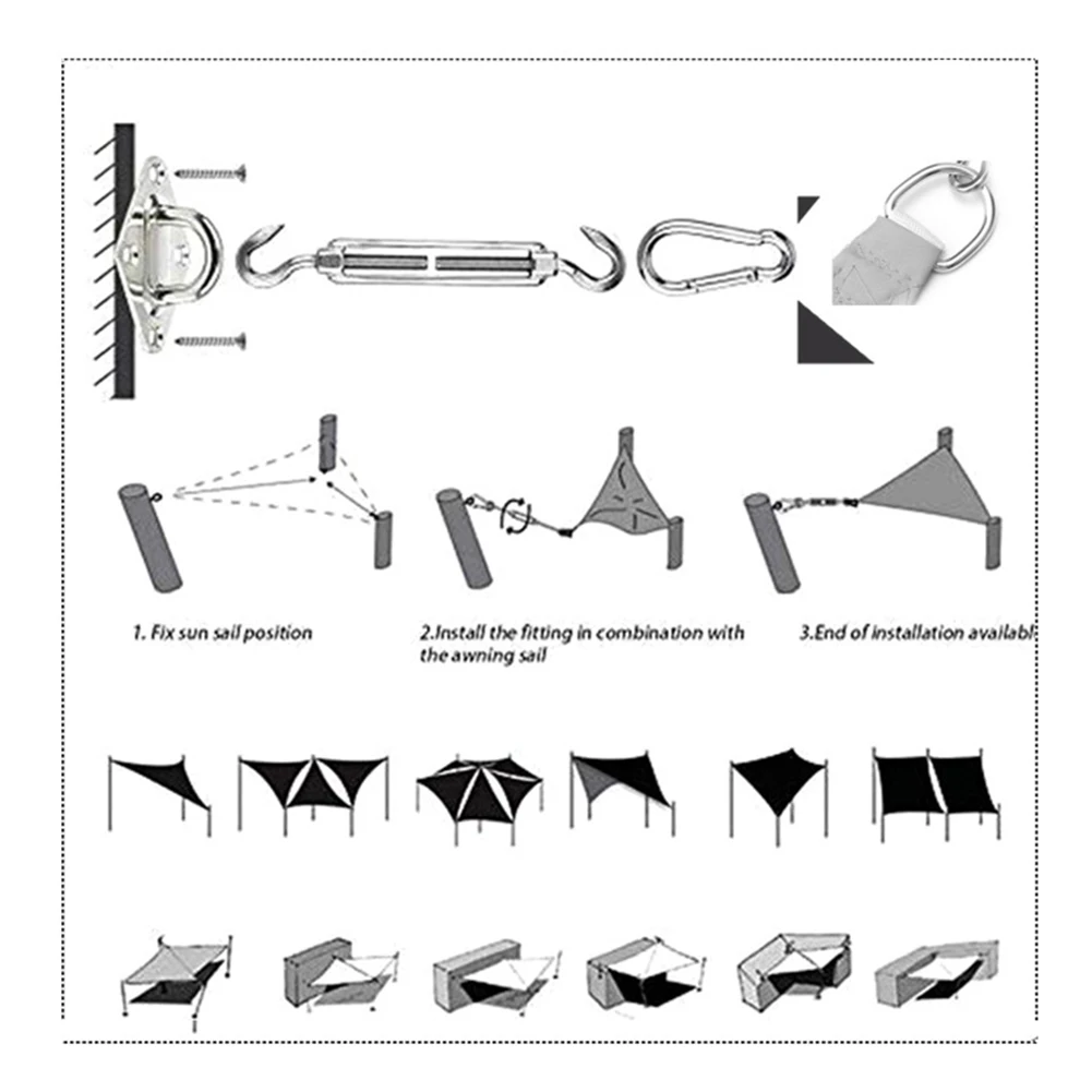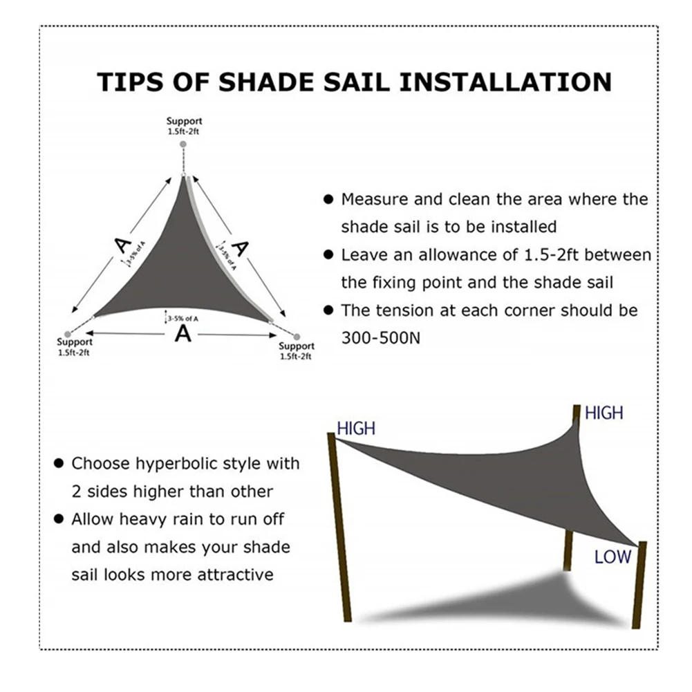 * 4. Простая установка: Измерьте и очистите область, где будет установлен теневой парус. Оставьте в размере 1,5-2ft между точки фиксации и солнцезащитным козырьком нейлон, чтобы соответствовать оборудования/крючки или канатов. Изогнутые стороны для повышения прочности тяги и предотвращения опускания, поэтому фактическая площадь затенения будет слегка уменьшаться, допуск 4 ~ 6 дюймов для каждой стороны. Вы можете установить различные тени паруса разных цветов и размеров, чтобы получить большую площадь затенения.