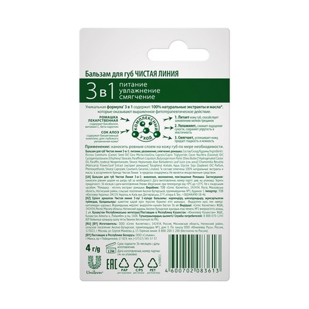 Чистая Линия бальзам для губ 3в1 питание и увлажнение 4 гр