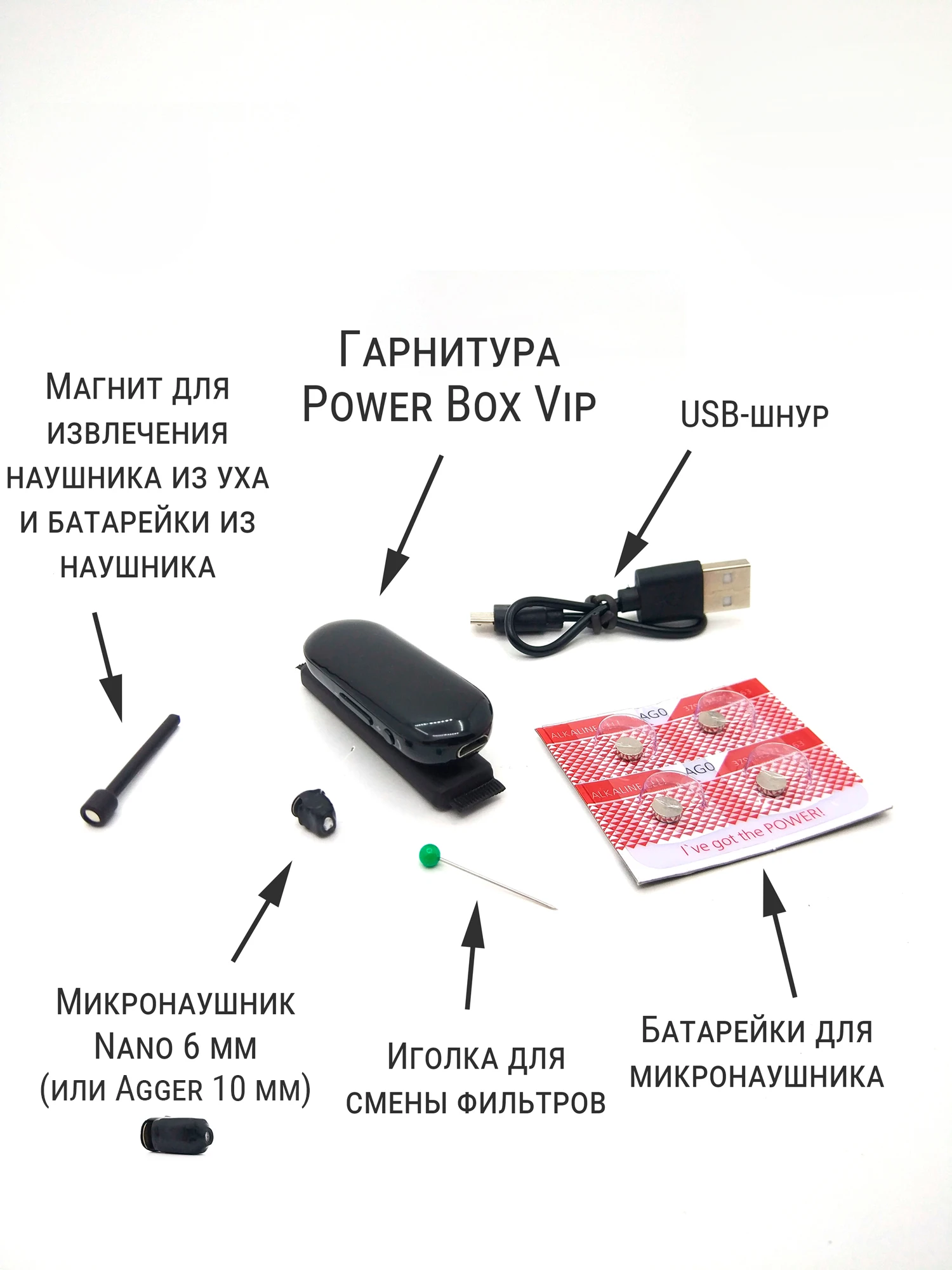- Bluetooth гарнитура VIP- Микронаушник Agger 10 мм (1 шт.)- Батарейка LR521 AG0 (4 шт.)- Инструкция и рекомендации по использованию- Упаковка и гарантийный талон