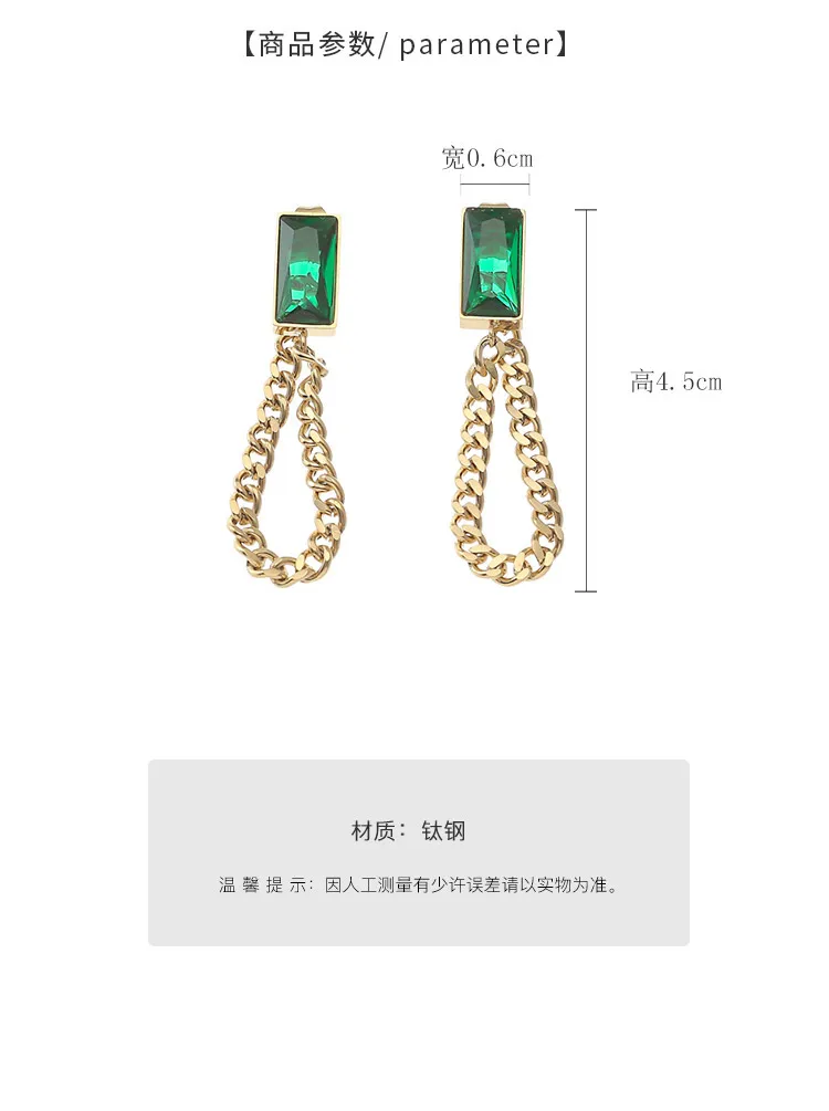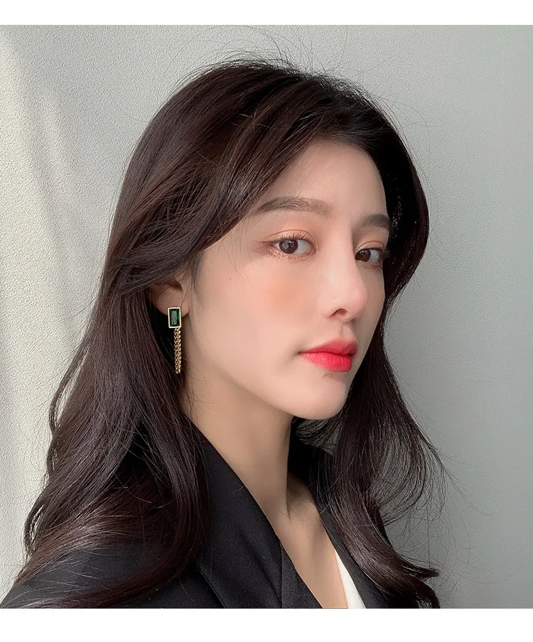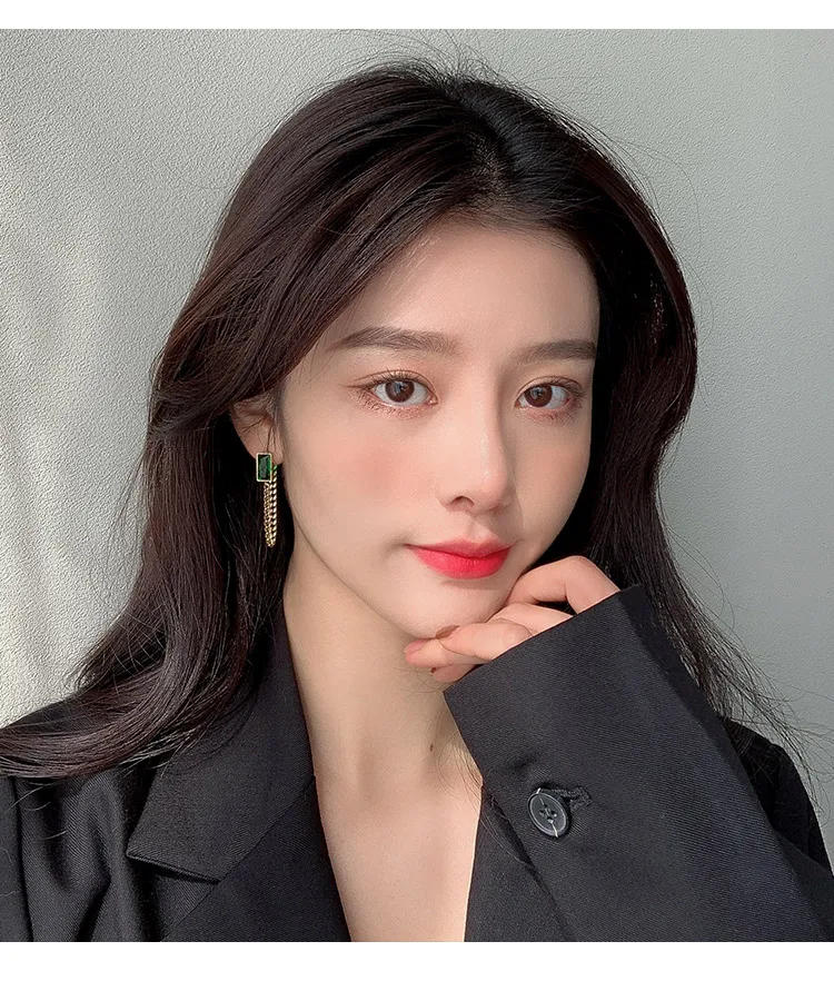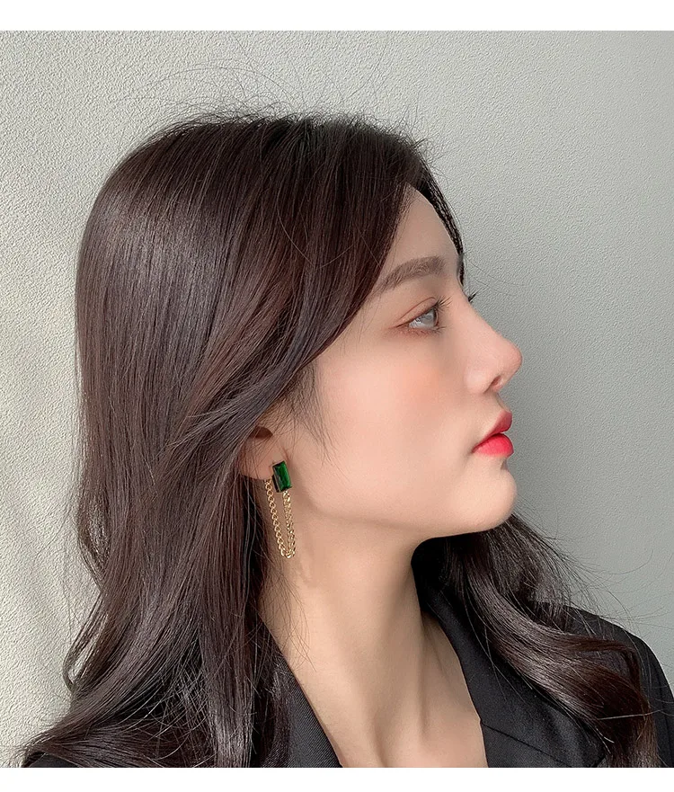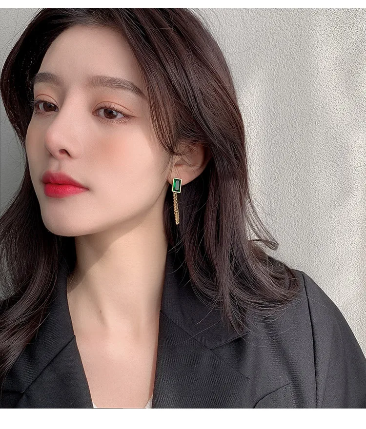 Новинка 2021, классические геометрические прямоугольные серьги из нержавеющей стали с зелеными кристаллами и кисточками, необычные аксессуары для девушек и женщин