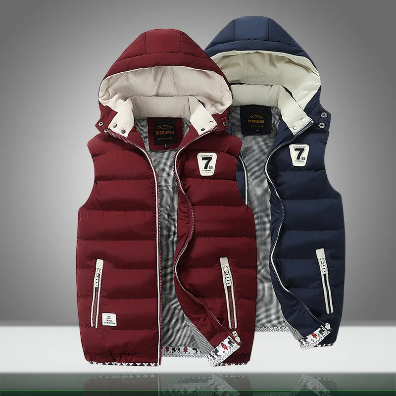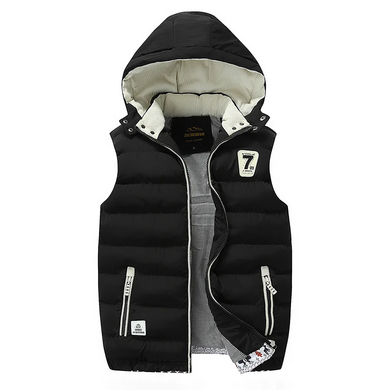 Зимние мужские куртки без рукавов, новинка, повседневный пуховой жилет, мужские теплые плотные однотонные пальто с капюшоном, мужской жилет с хлопковой подкладкой, куртка