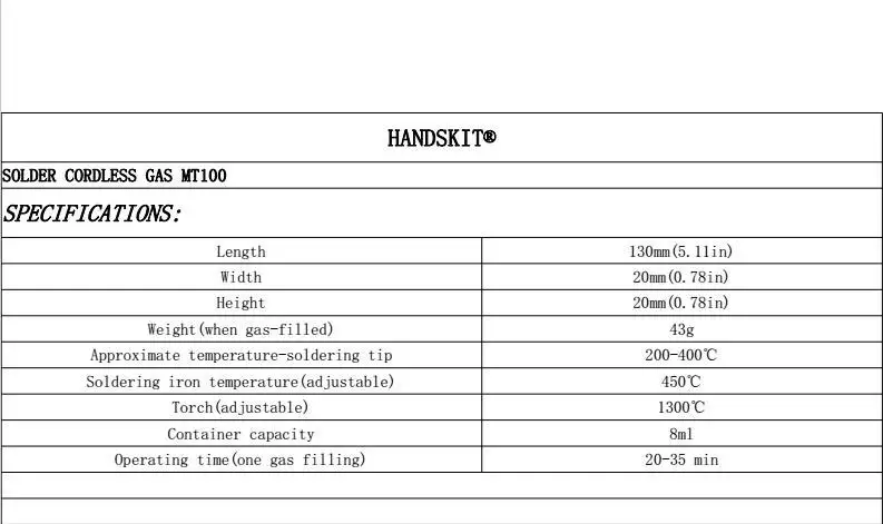 Температура: температура пламени 1300 ℃ (регулируемая), температура паяльника 400 ℃ (регулируемая)