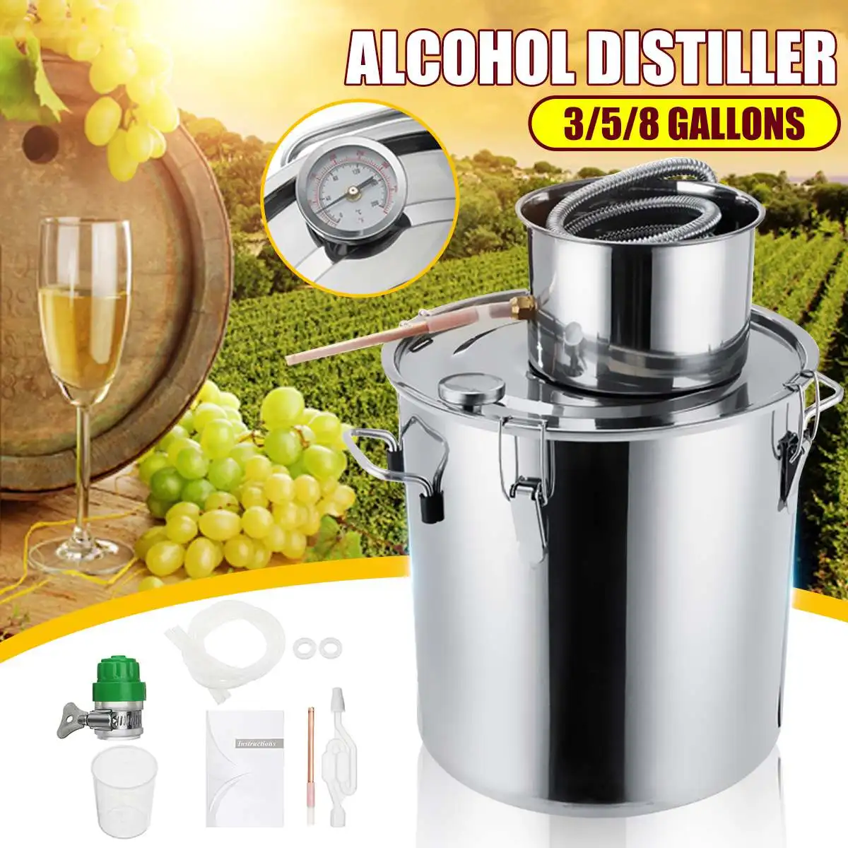 Примечания:1. Пожалуйста, очистите и высушите дистиллятор после использования.2. (не включая) вам понадобится: дрожжи, вода, источник тепла (я предлагаю использовать газовую плиту)Посылка:1 х кастрюля для ферментера1 х охлаждающий горшок1 x чашка1 х водяной шланг1 x медная колонна1 x значение выхлопа1 Инструкция1 x подключение2 х уплотнительное кольцоТехнические характеристики-Размер: как показано на картинке-Емкость: 3/5/8 галлоновОсобенности-Этот продукт изготовлен из нержавеющей стали. Конструкция включает в себя независимый воздушный путь, который позволяет дистилляту быстрее расти и доставлять более высокую чистоту. Это утонченный и универсальный предмет оборудования.-Это многофункциональное оборудование используется для: дистилляции фруктового вина, дистилляции воды, очистки воды, дистилляции коньяка и рафинирования растительных экстрактов в медицинских целях.