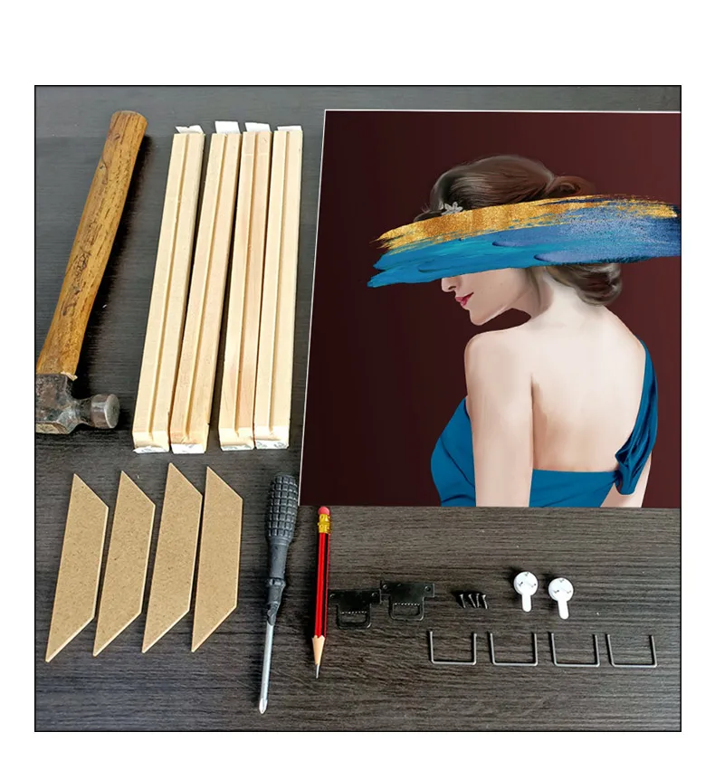 1. Картина (без этого, вам нужно подготовить)2. Рамка3. Картон4. "U" гвоздь5. Черный крюк и небольшой винт6. Инструменты: молоток, отвертка (без этого, вам нужно подготовить)