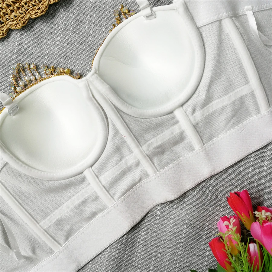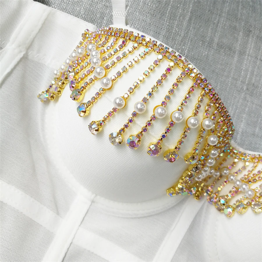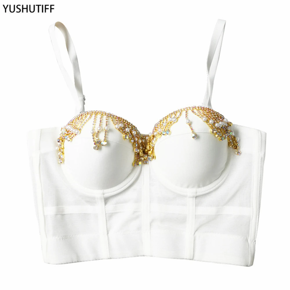 Летний кроп-топ с бусинами и цепочкой, Женский танцевальный клубный корсет с открытыми плечами, сексуальный сетчатый топ со встроенным бюстгальтером, Бралетт с эффектом пуш-ап 8155
