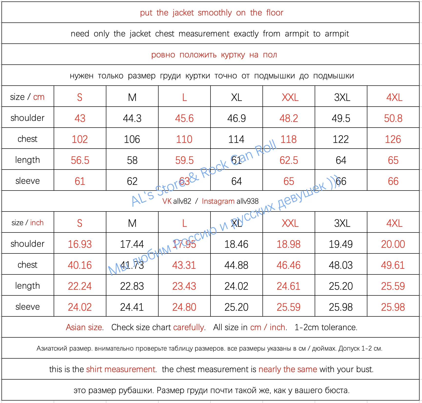 Пожалуйста, проверьте таблицу размеров и измерьте вашу куртку, как показано ниже.