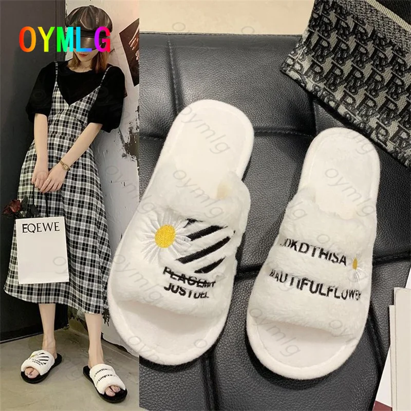 Тапочки большого размера, искусственная кожа, корейский стиль, открытый носок, маленькие маргаритки, буквы, плюшевые женские Тапочки
