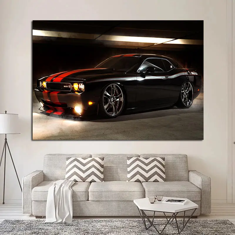 Картина на холсте черная Dodge Challenger с красными полосками автомобиль Современная Настенная картина плакаты и принты для декора гостиной