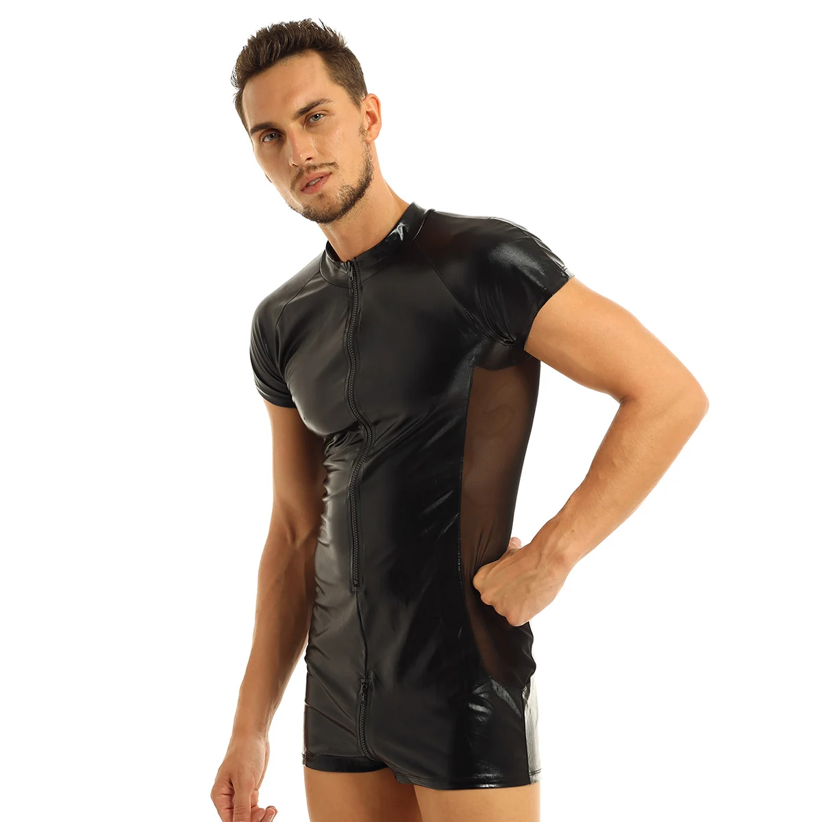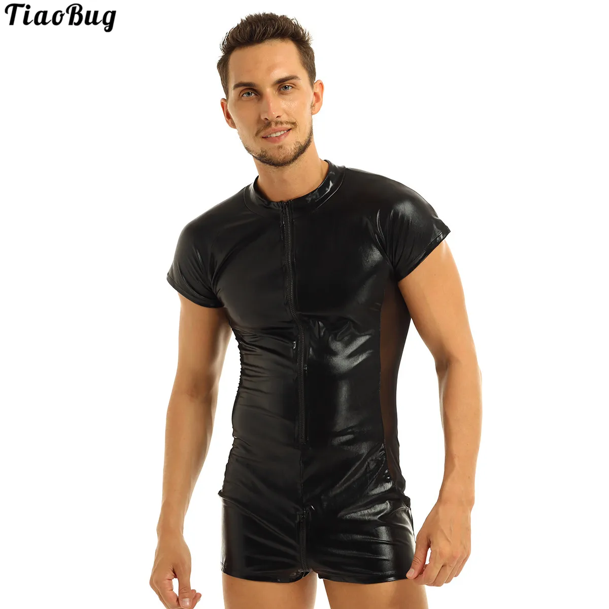 Летнее черное Мужское боди TiaoBug из лакированной кожи с короткими рукавами и молнией спереди, Цельный купальник, боди с сетчатым боковым купальником