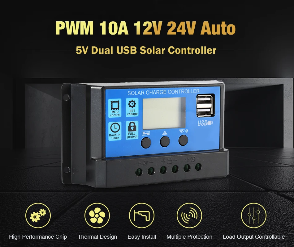 Автоматический контроллер заряда солнечной батареи POWLAND, 10 А, 12 В, 24 В, ШИМ-контроллеры, ЖК-дисплей, двойной USB, 5 В выход, регулятор солнечной панели PV