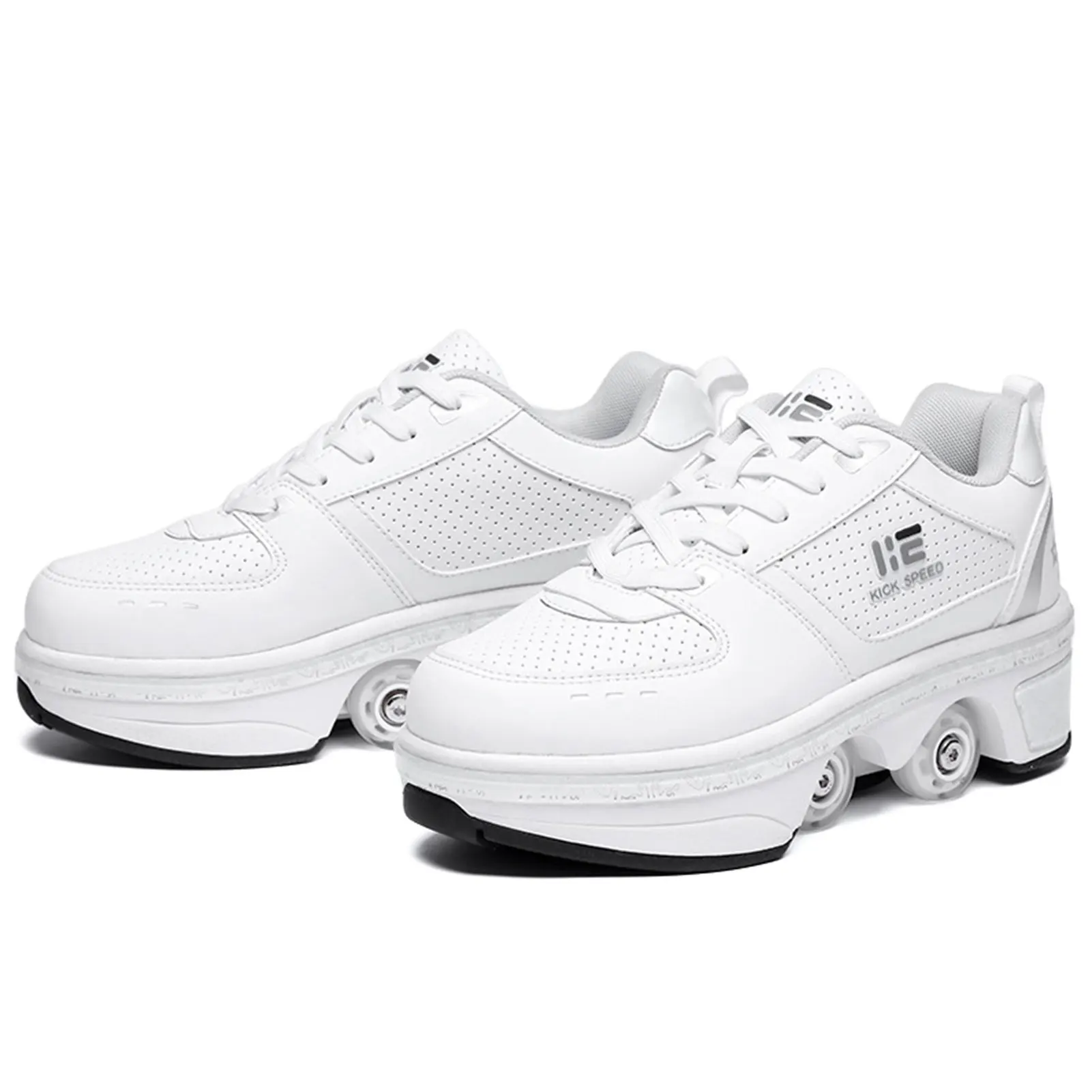 Деформация роликовая обувь Паркур колесная обувь 4 колеса ходовые ботинки роликовые коньки обувь для унисекс обувь для катания на конькахОсобенности:1. Практичная кнопка: обувь имеет уникальную невидимую кнопку, чтобы предотвратить случайное открытие. И есть кнопка на задней части обуви, нажмите на нее, и колесо раскроется. Нажмите и удерживайте кнопку, вставьте колесо в нижнюю пластину и отпустите.2. Удобно носить: обувь имеет структуру верхней части стопы, чтобы эффективно защитить пятку и сделать обувь более удобной в носке.3. Широкое применение: обувь стильная и крутая, а деформационная обувь отлично подходит для катания на коньках, вечерние, дискотеки, танцев, дня рождения, Рождества.4. Легко носить с собой: маленький и светильник, легко носить с собой, свободно устанавливается на плоской подошве, устраняет хлопот при переноске и сборке.5. Безопасный и практичный: обувь имеет хороший баланс, так что вы можете легко контролировать центр тяжести тела, и обувь безопасна в использовании и легка.Характеристики:Название: обувь для фигурного катанияМатериал колеса: АБС-пластикКолесо: PU колесоМатериал подошвы: ЭВА + резинаРазмер: 31-43Вес подшипника: 300 кгПодходящий Пол: мужской/женскийУпаковочный лист:1 x роликовая обувьОбщие методы решения проблем:1. Переключатель застревает и не может поворачиваться: инструмент может быть вставлен в край круглого отверстия переключателя, чтобы вытащить выключатель.2. Переключатель не открывается: Проверьте, слишком ли плотно зажимается колесо. Если колесо слишком тугое, замените левое и правое колеса3. Колеса не на месте: Очистите примеси в кронштейне, добавьте смазку к частям трения и переключитесь между кронштейнами.4. Колесо не закрывается автоматически и выскакивает: Нажмите деталь шатуна между задними колесами, чтобы сделать позиционный штырь полностью защелкивающимся в слот.Примечания:1. При открытии и укладке колеса убедитесь, что направление стрелки находится в вертикальном положении, а затем нажмите на переключатель с определенной силой (мгновенная ударная сила).2. Направление стрелки не является вертикальным замком. Это состояние замка безопасности. Заблокированное состояние не может переключить колесо.